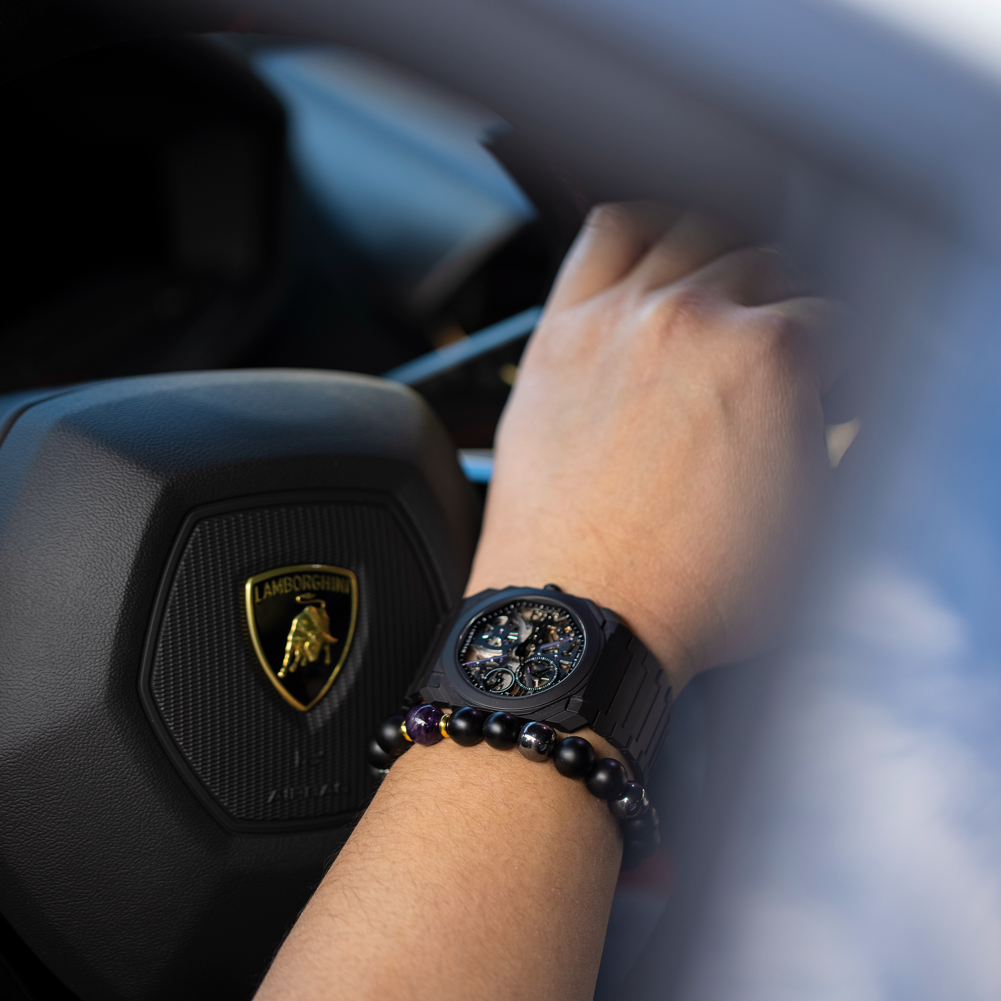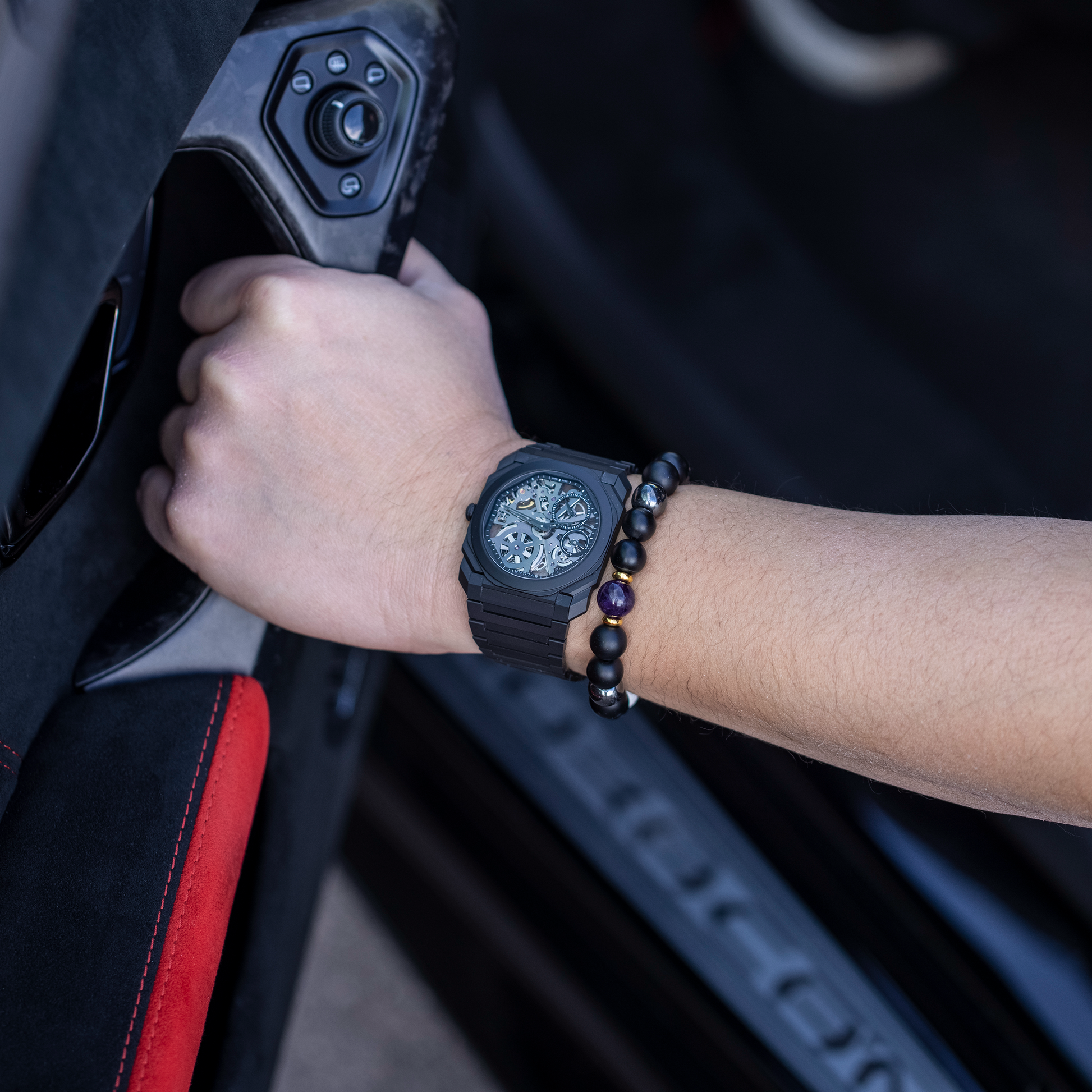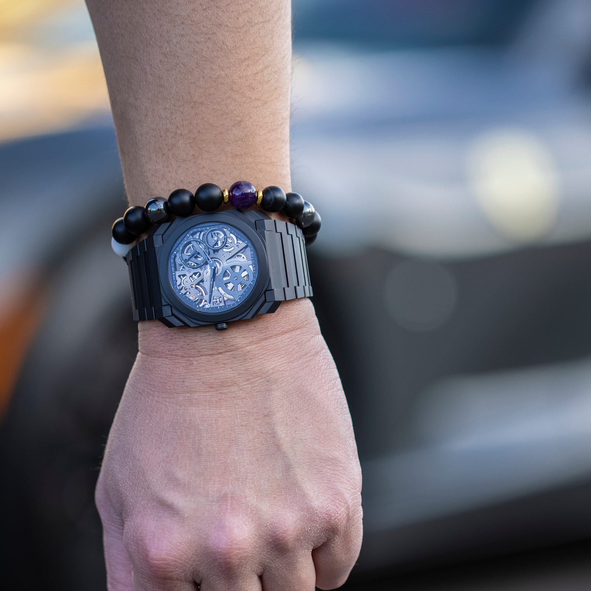 Sculpted with intention, this bracelet is a tribute to contemporary mastery. Geometric in its balance and tonal in its presence, it fuses violet amethyst, polished hematite, white jade, and matte onyx agate into a form that feels both bold and meditative. Designed to harmonize with sleek silhouettes and complex finishes, it speaks to those drawn to refined edges and quiet power.