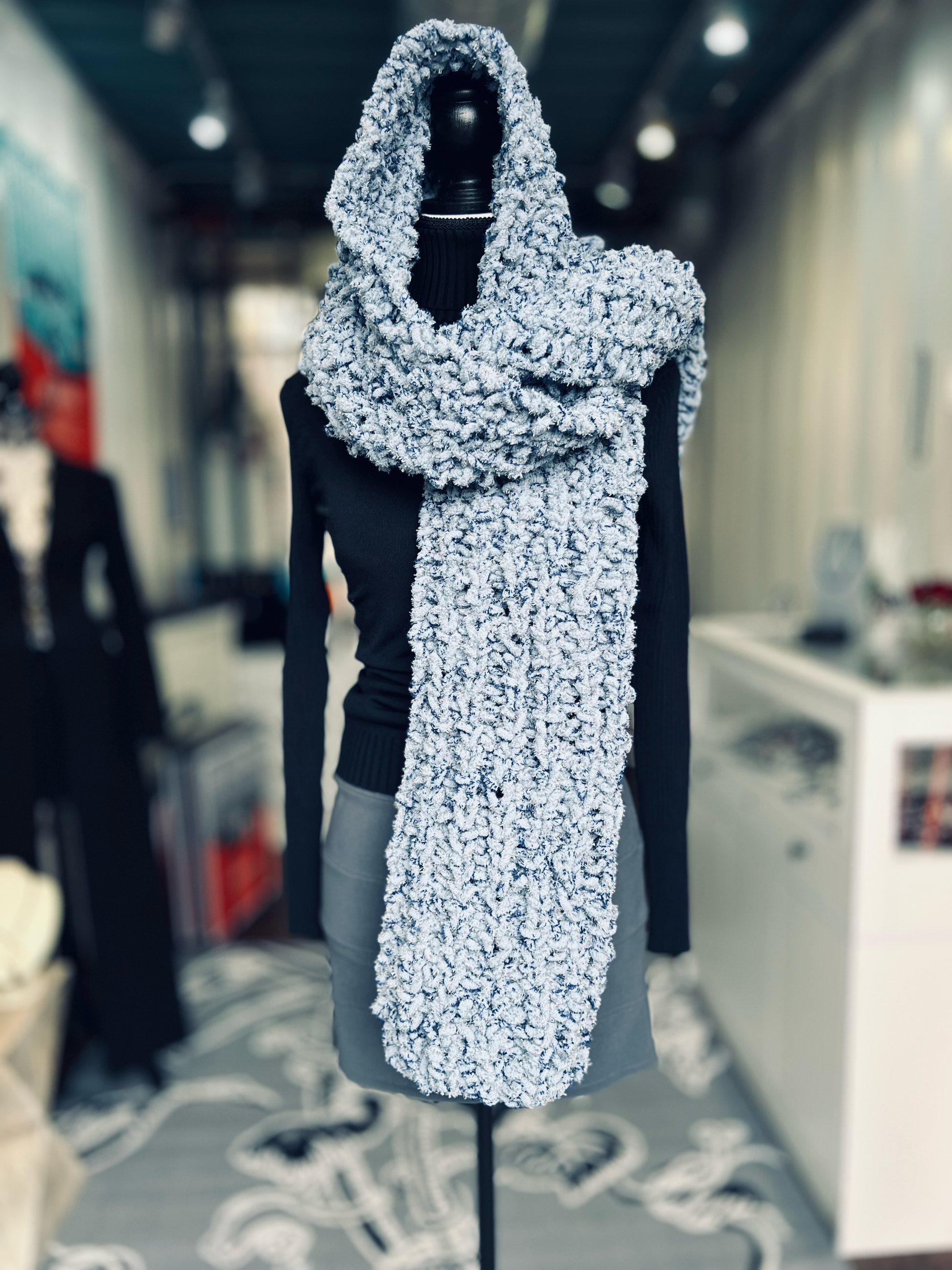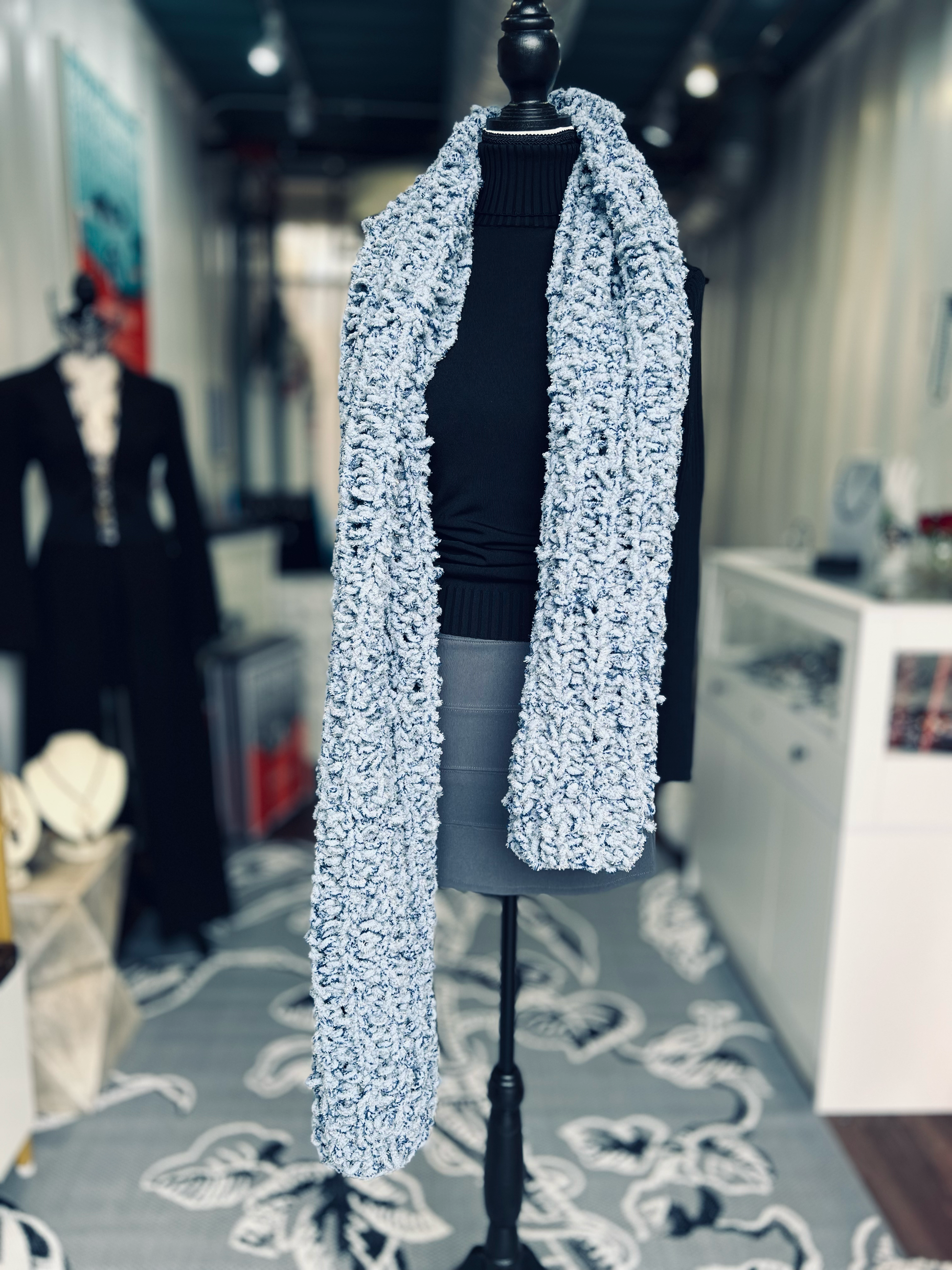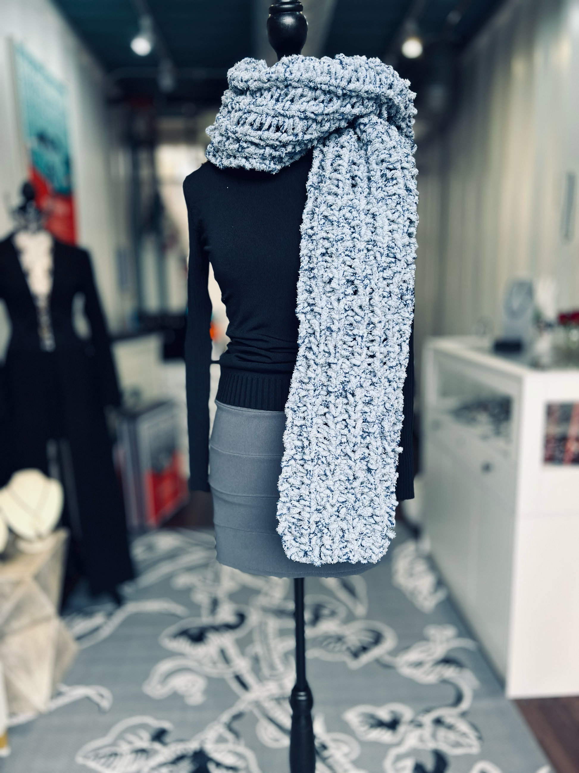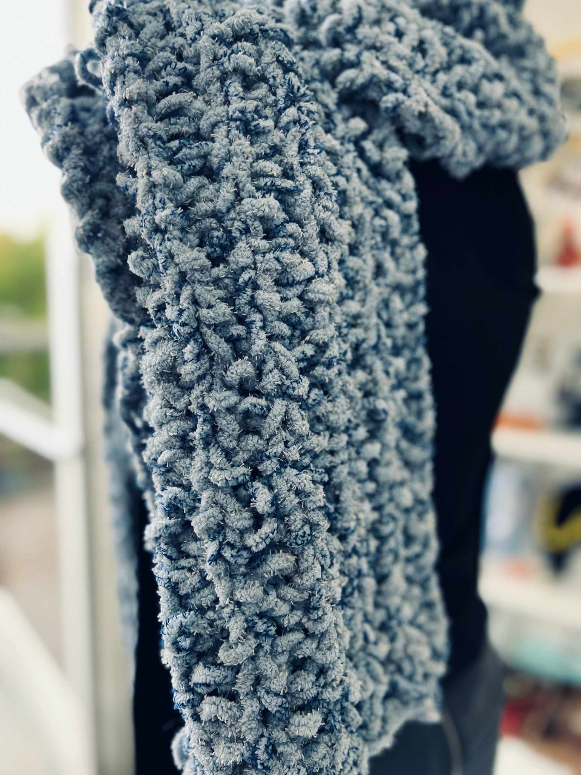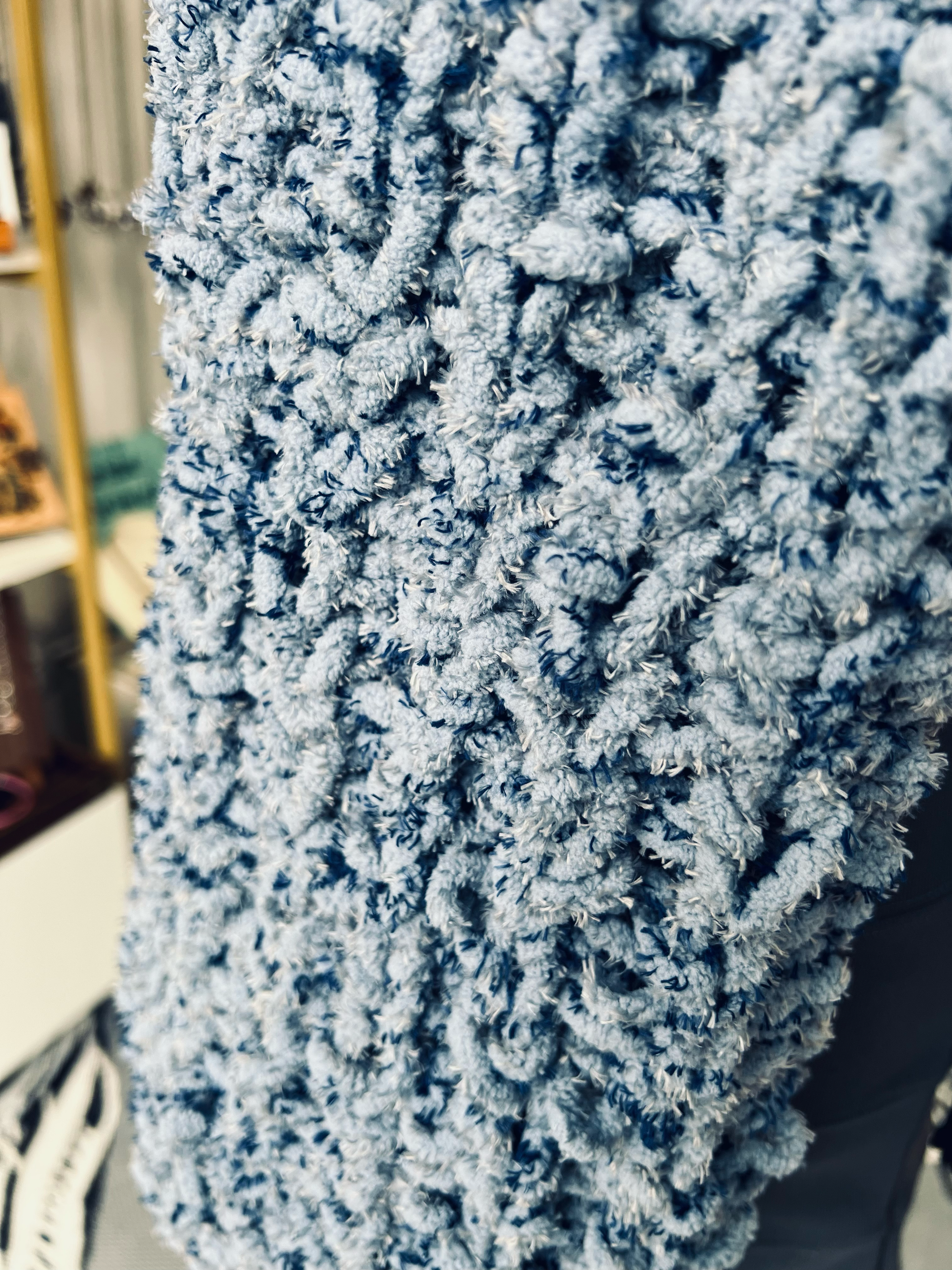 Hand-knit from plush blanket yarn in soothing shades of medium blue with dark blue speckles, Blue Haven feels like a soft escape from the chill — a comforting retreat you can wrap around yourself. Its chunky texture and gentle imperfections make it beautifully human, like something a loved one crafted just for you.