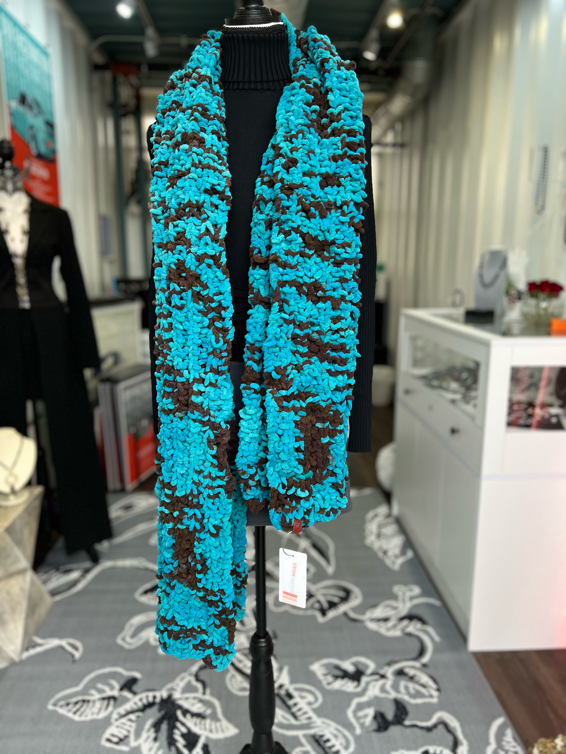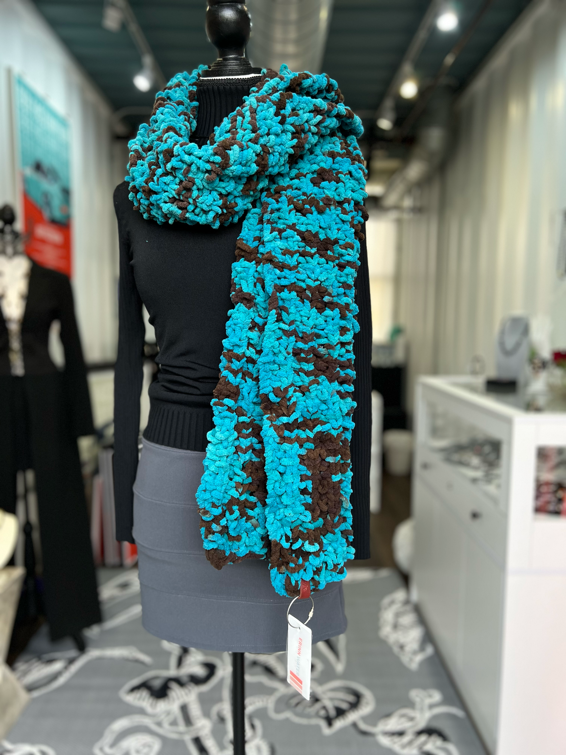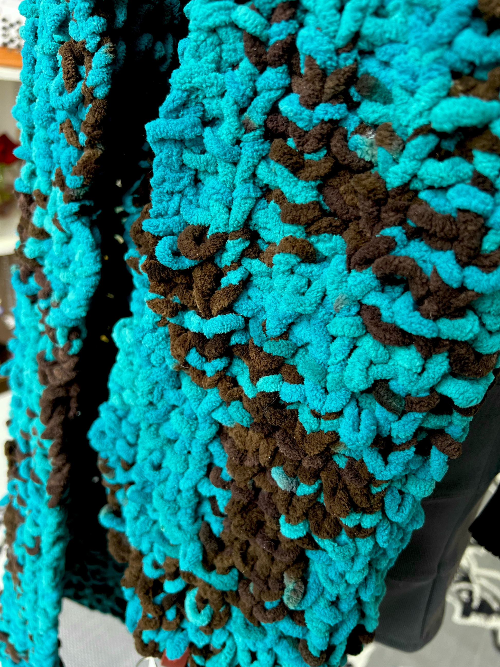Where ocean calm meets woodland warmth, Tide & Timber captures the quiet strength of nature in every stitch. Hand-knit with sumptuously soft blanket yarn, its deep, bright teal tones are interspersed with rich espresso brown, echoing the meeting of sea and soil — vibrant yet earthy, striking yet soothing.