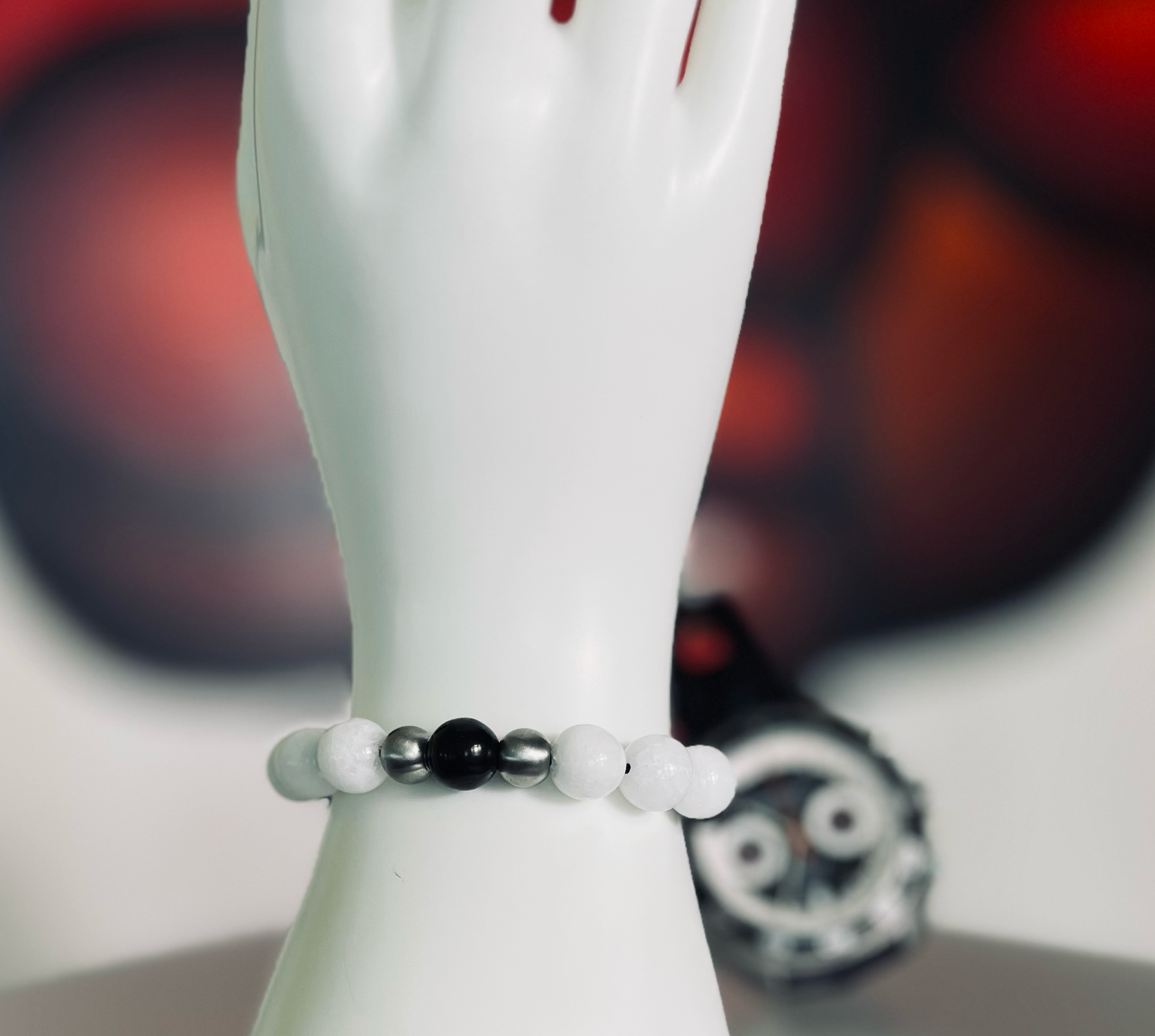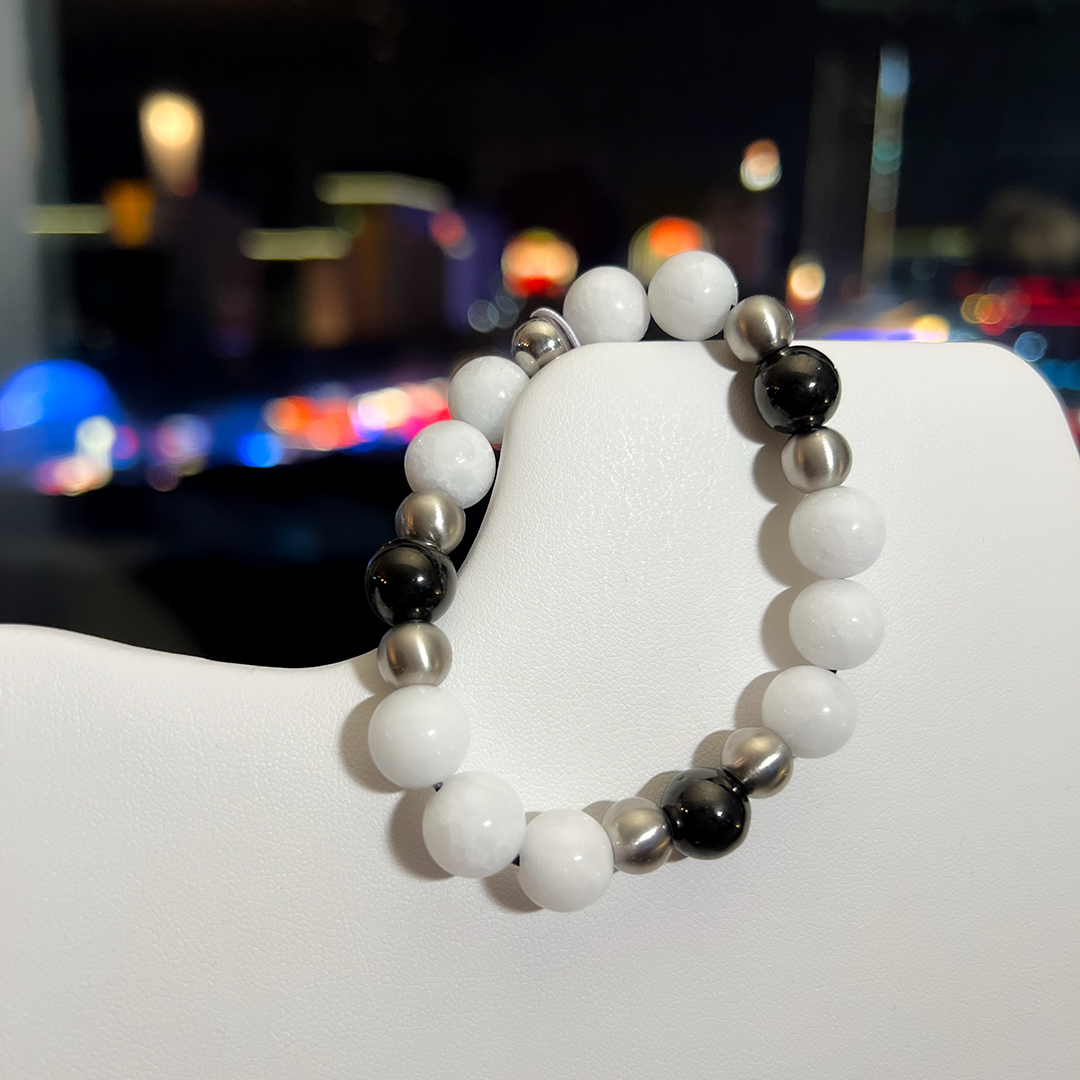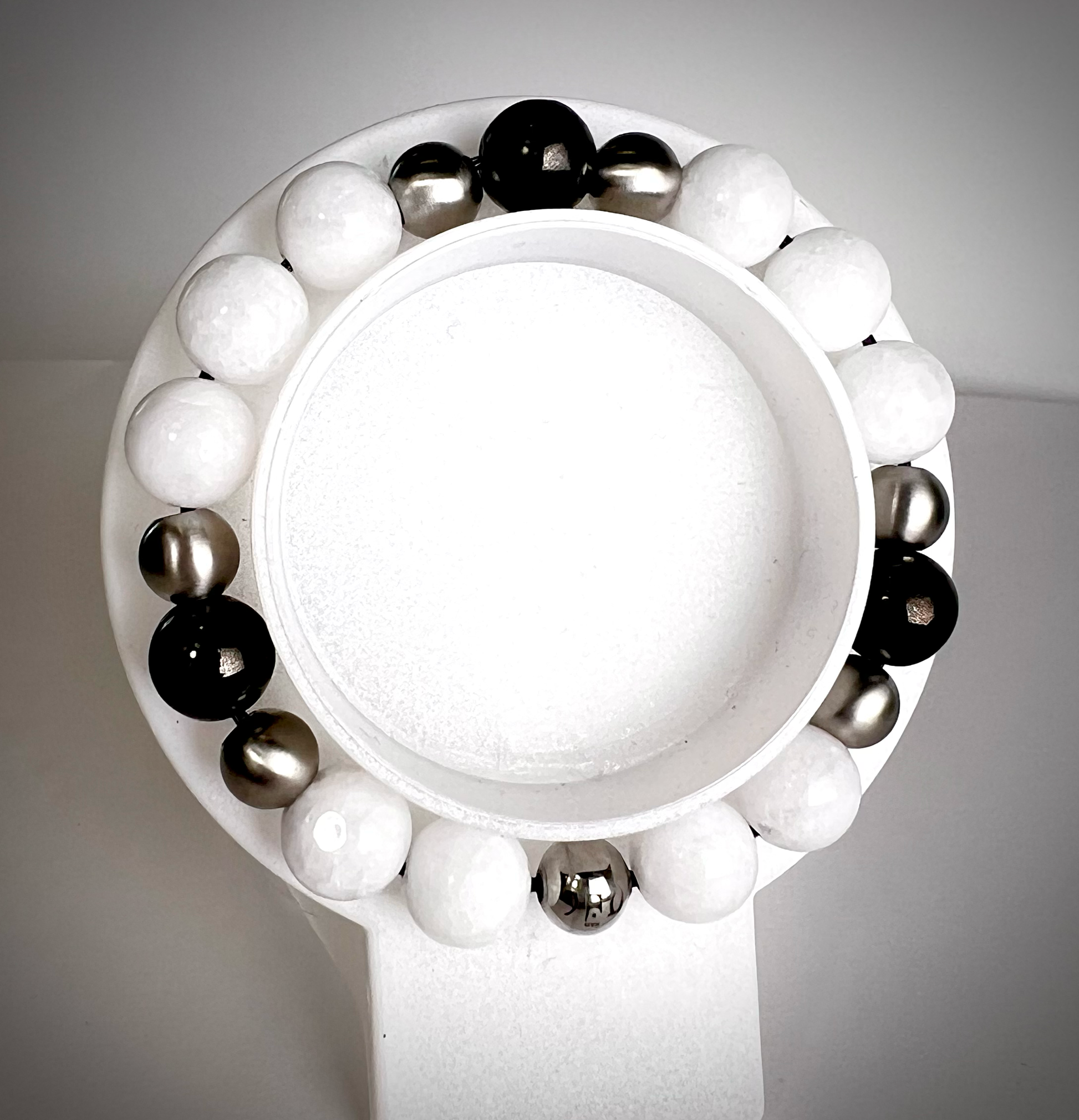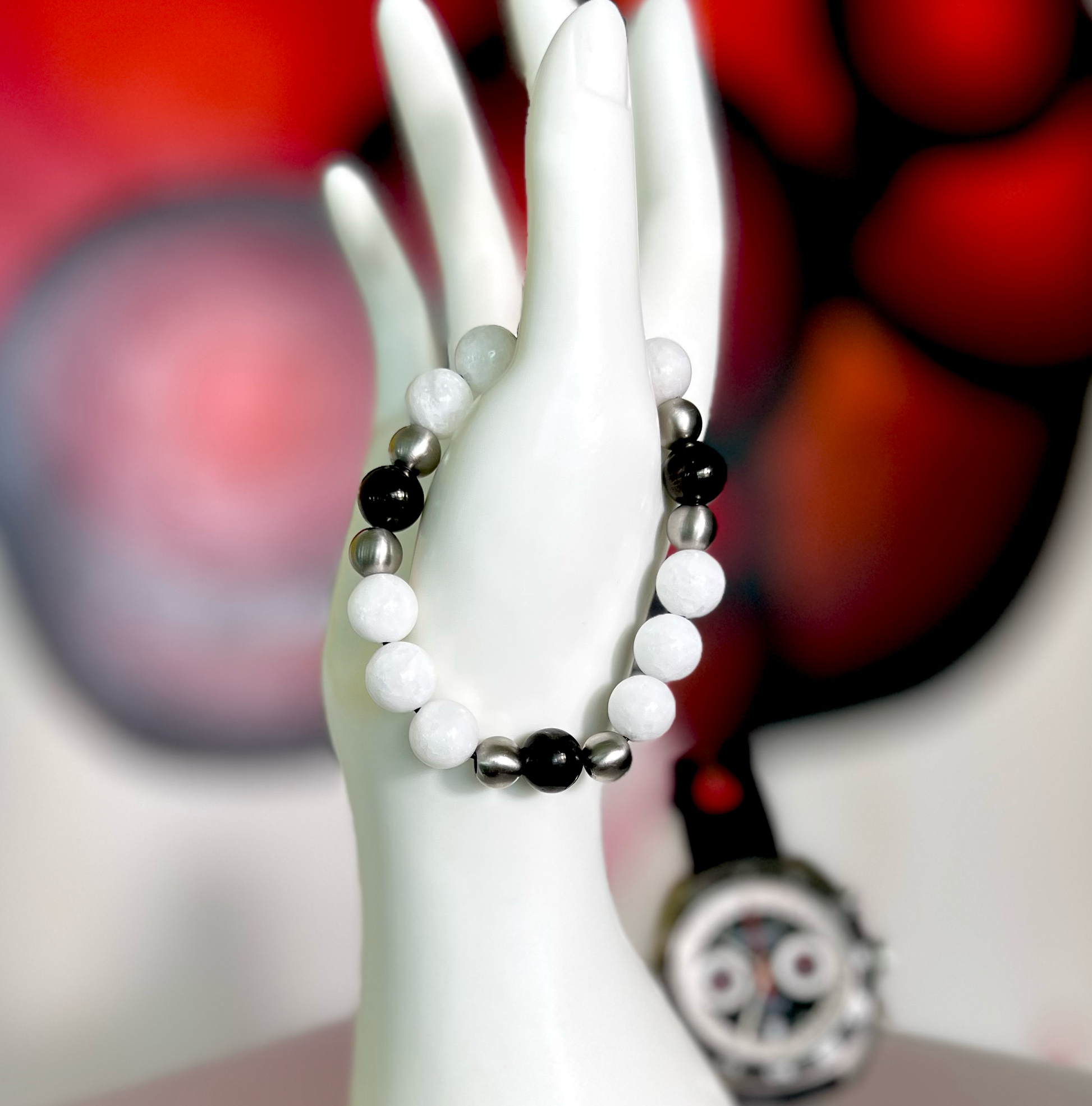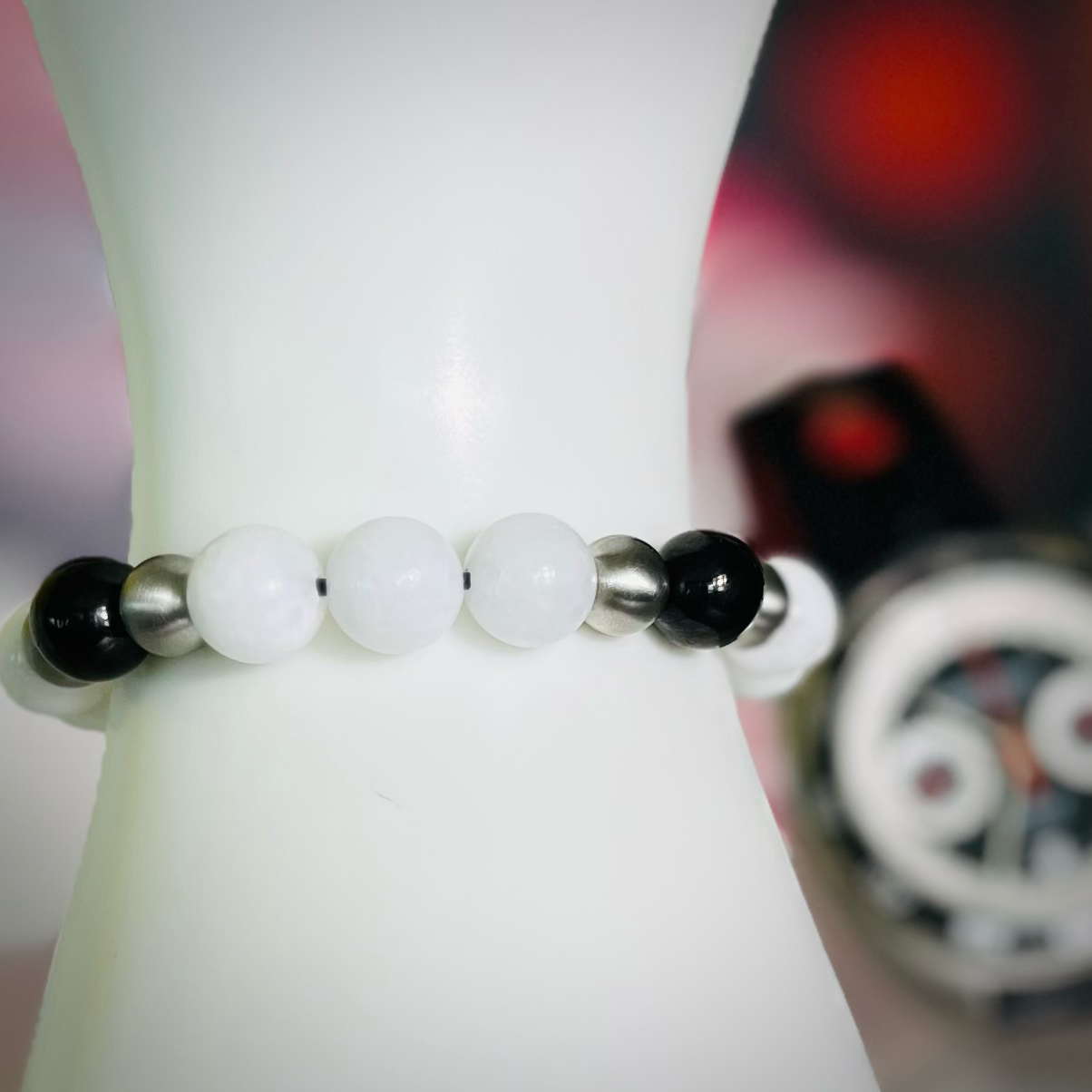 Bold and rhythmic, this bracelet leads with crackled white agate — each polished bead a frozen flash of light — countered by the gleaming depth of black onyx. Framed with brushed stainless steel, each black note becomes a heartbeat in a cadence of contrast. This design is a commanding nod to timeless elegance, made to complement watch faces that tell more than time.