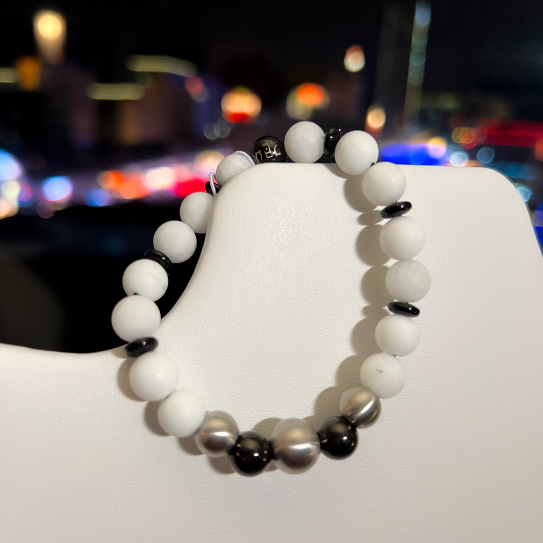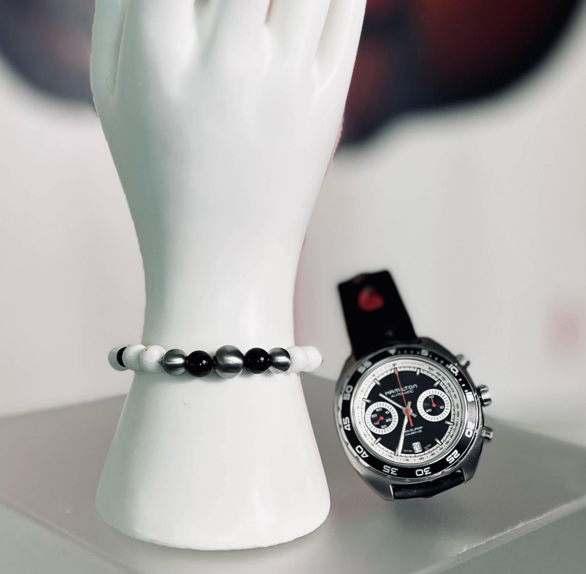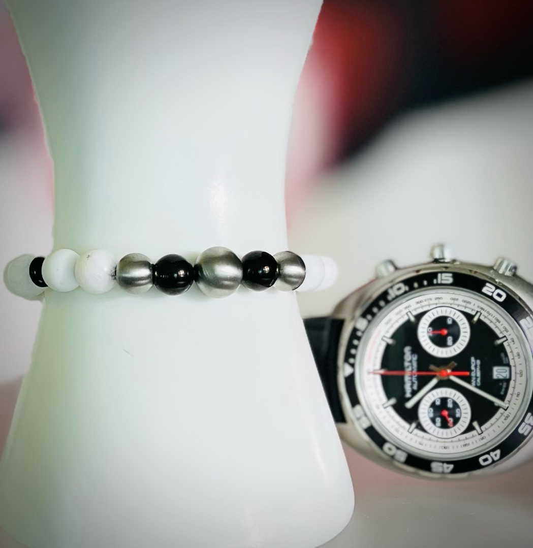 Understated and meticulous, this design plays in quieter tones — matte white agate, softened by texture, flows between flat black Czech glass rondelles. The focal point: a hand-brushed stainless steel bead, flanked by polished onyx and additional steel, a subtle salute to the craftsmanship of monochrome legends. This bracelet may whisper, but it never fades.