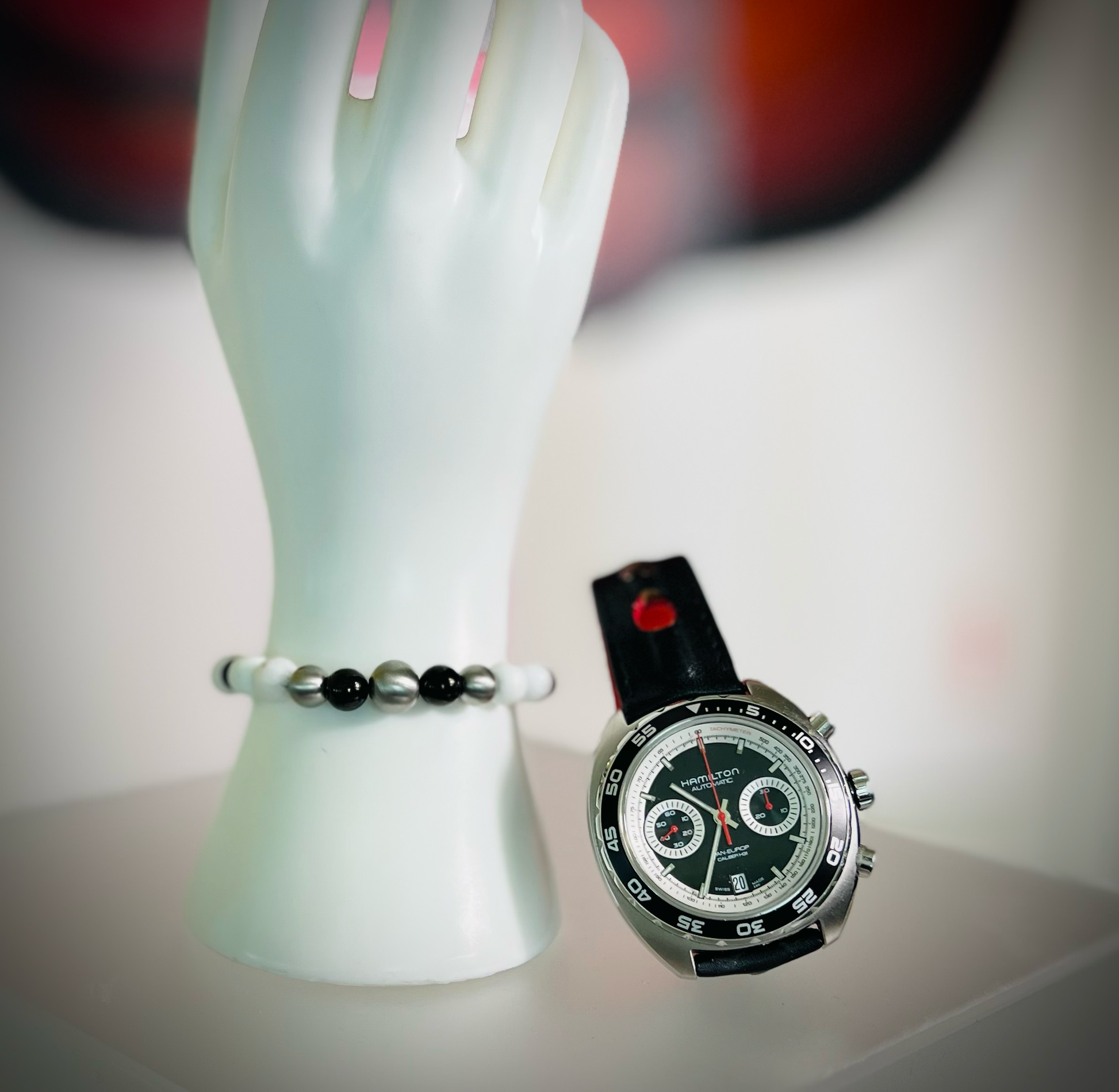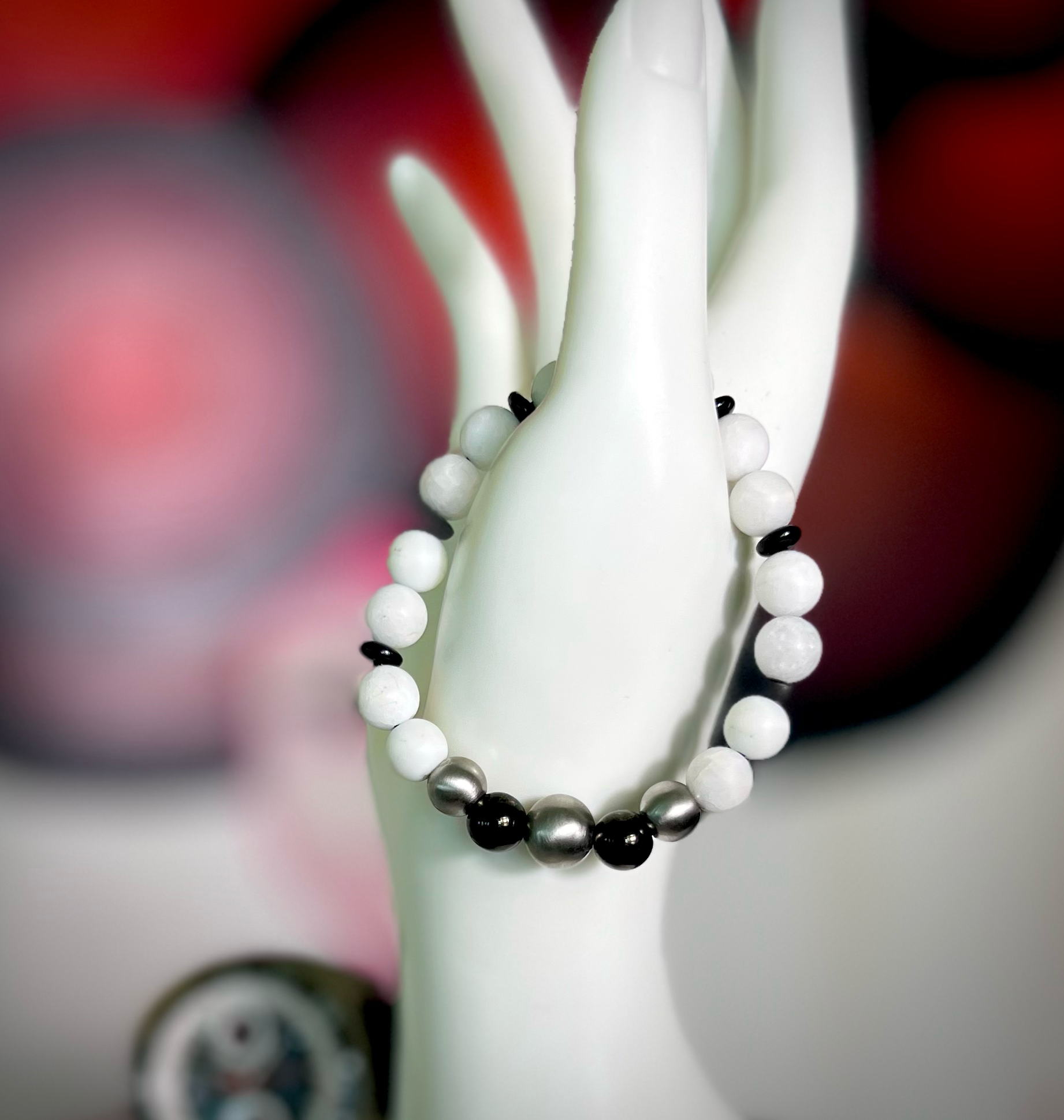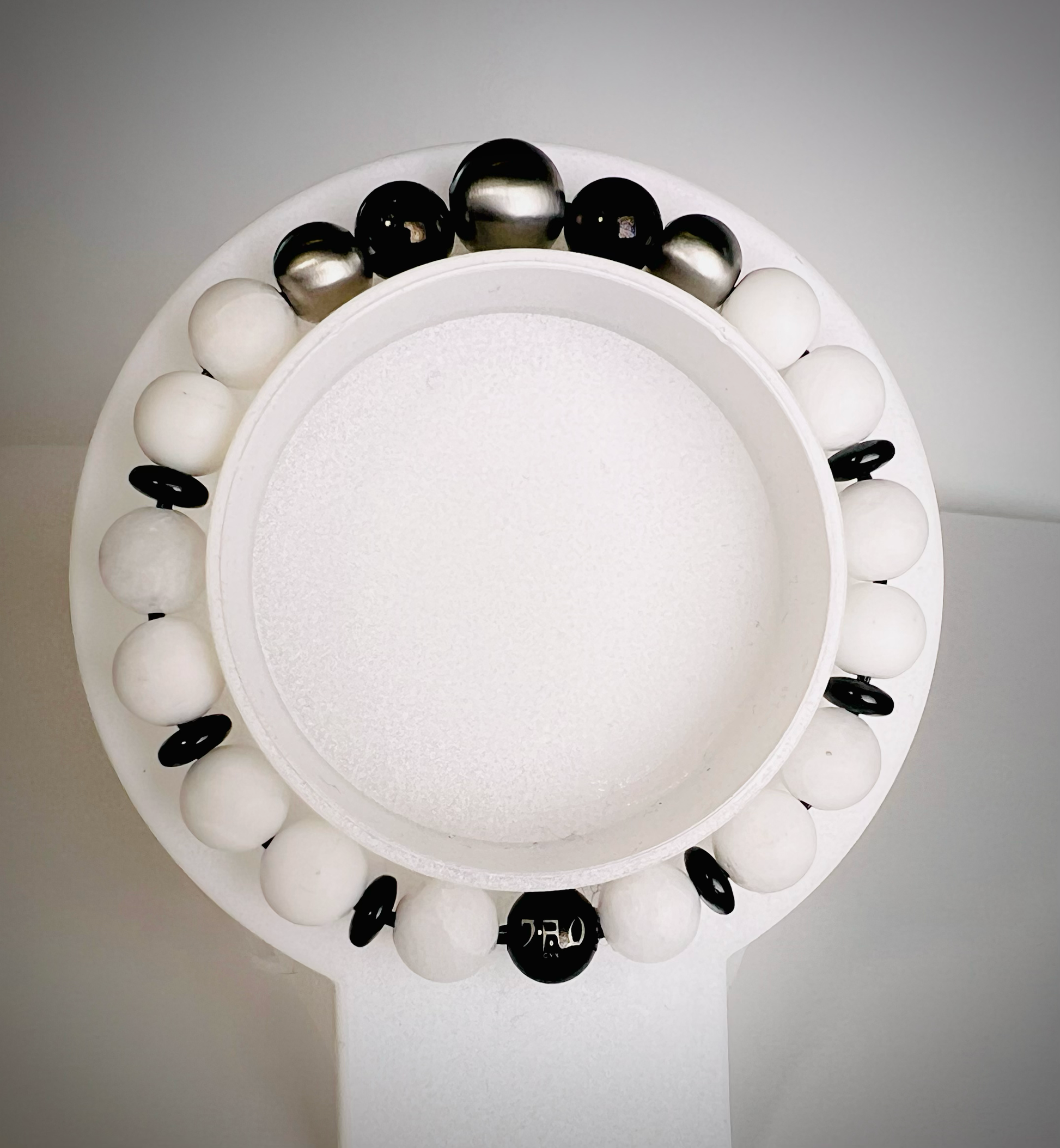 Understated and meticulous, this design plays in quieter tones — matte white agate, softened by texture, flows between flat black Czech glass rondelles. The focal point: a hand-brushed stainless steel bead, flanked by polished onyx and additional steel, a subtle salute to the craftsmanship of monochrome legends. This bracelet may whisper, but it never fades.
