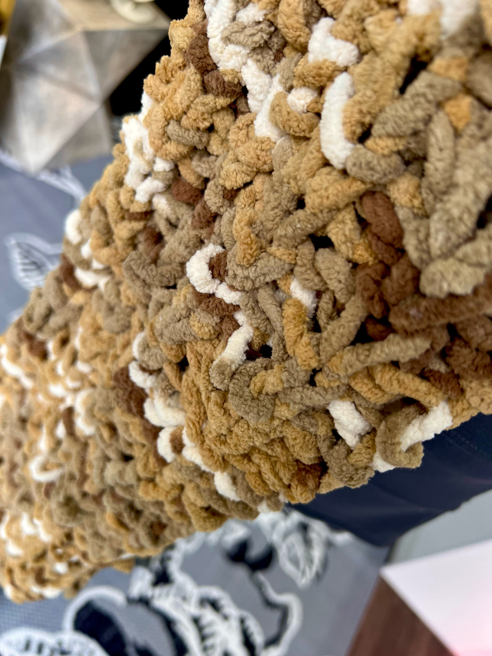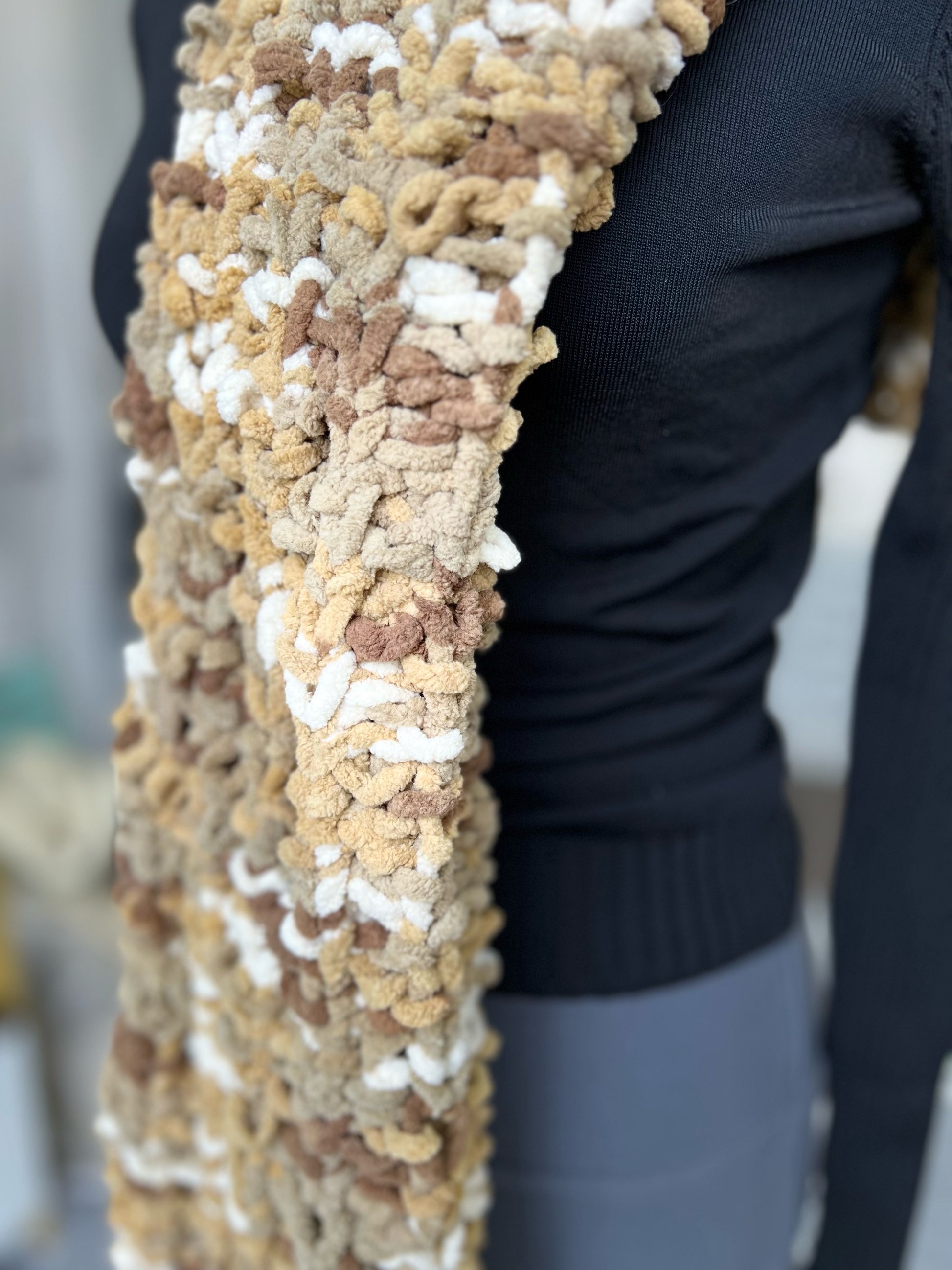 Rich and comforting as a winter sip of hot chocolate, Cocoa Drift blends shades of milk chocolate, gray-brown, caramel, and creamy white into a soothing symphony of warmth. Hand-knit with plush blanket yarn, its chunky texture and gentle variations in stitch tension give it that cherished, handmade charm — the kind that feels like a gift from someone who knows you well.