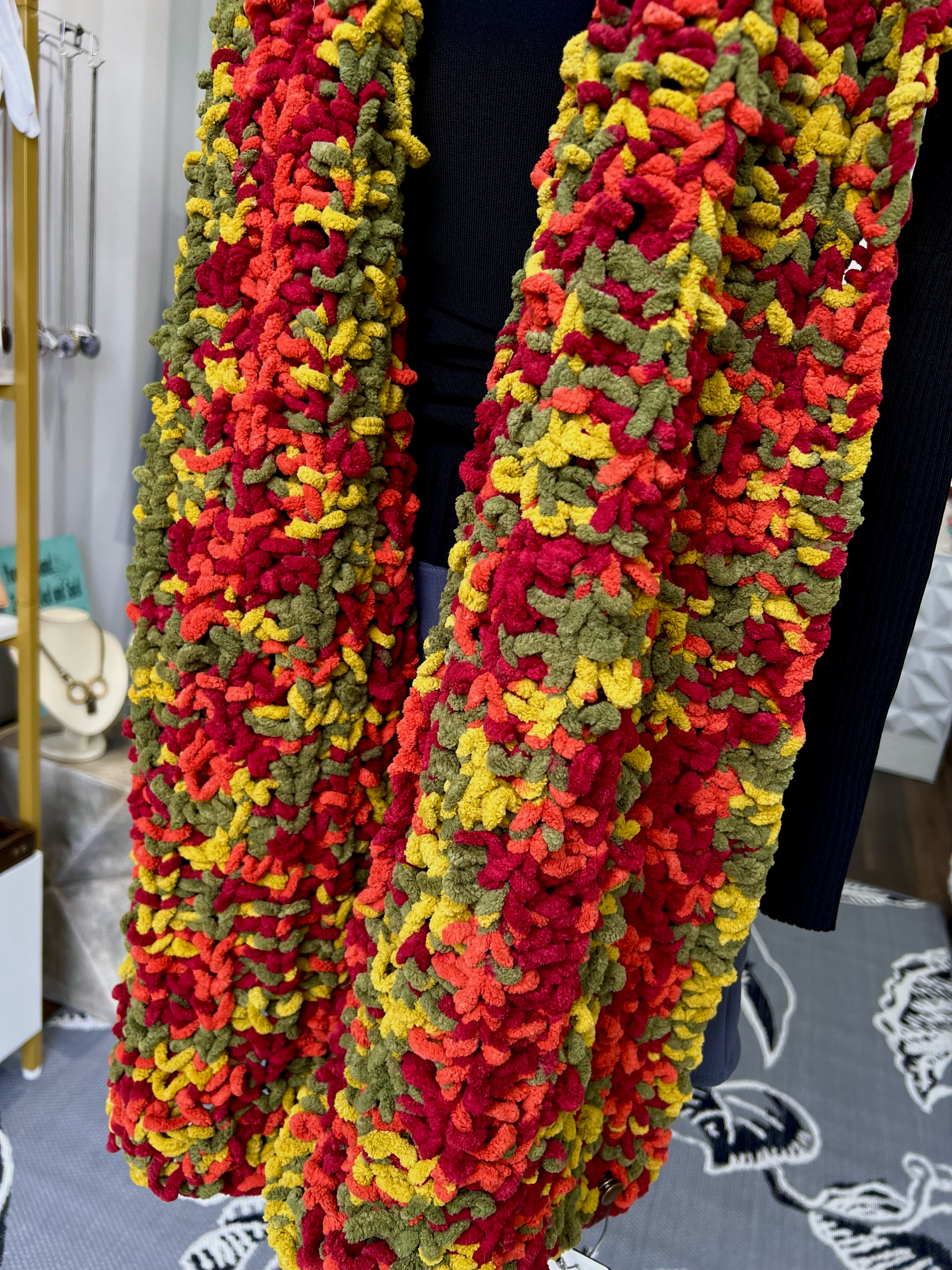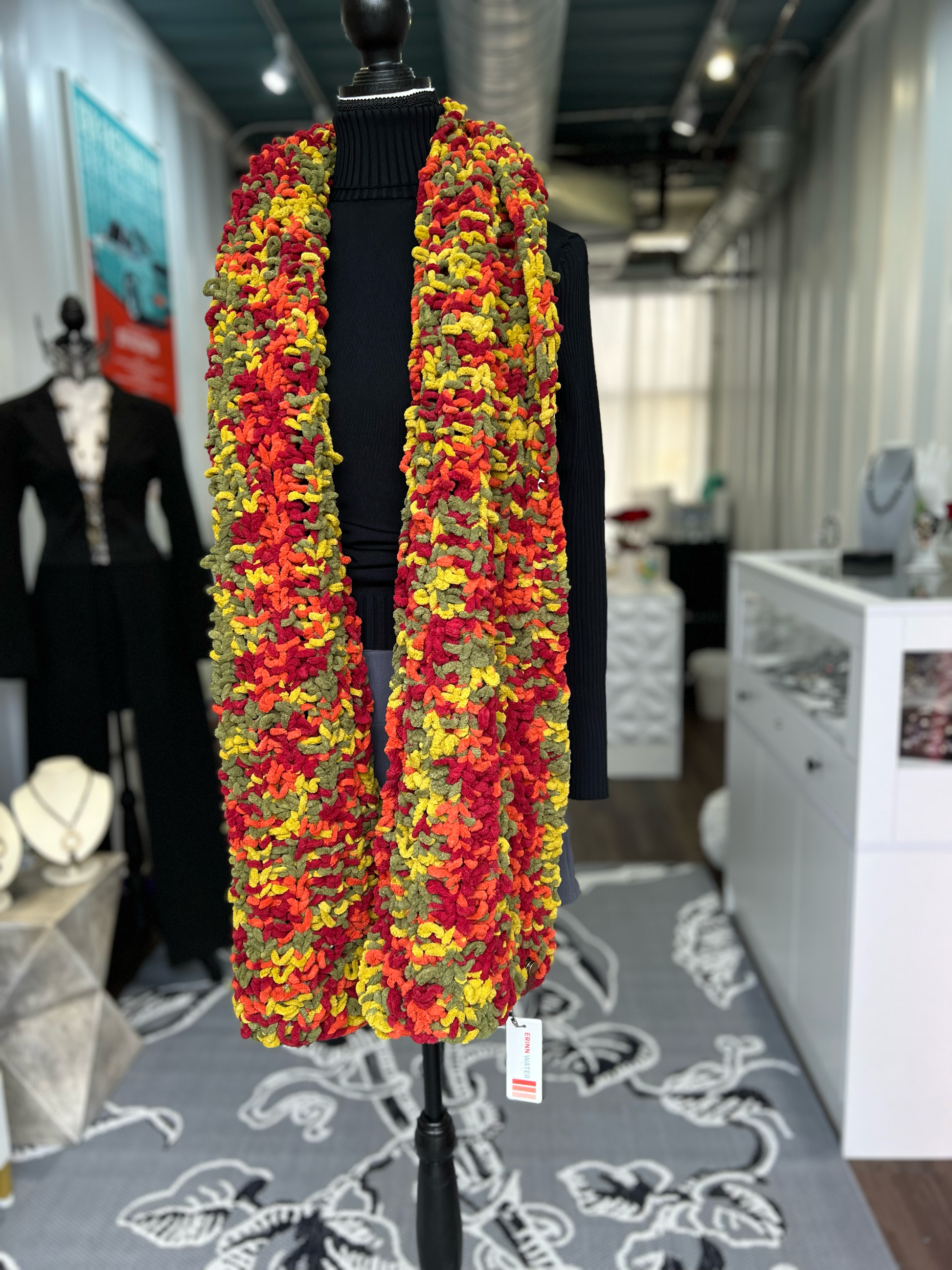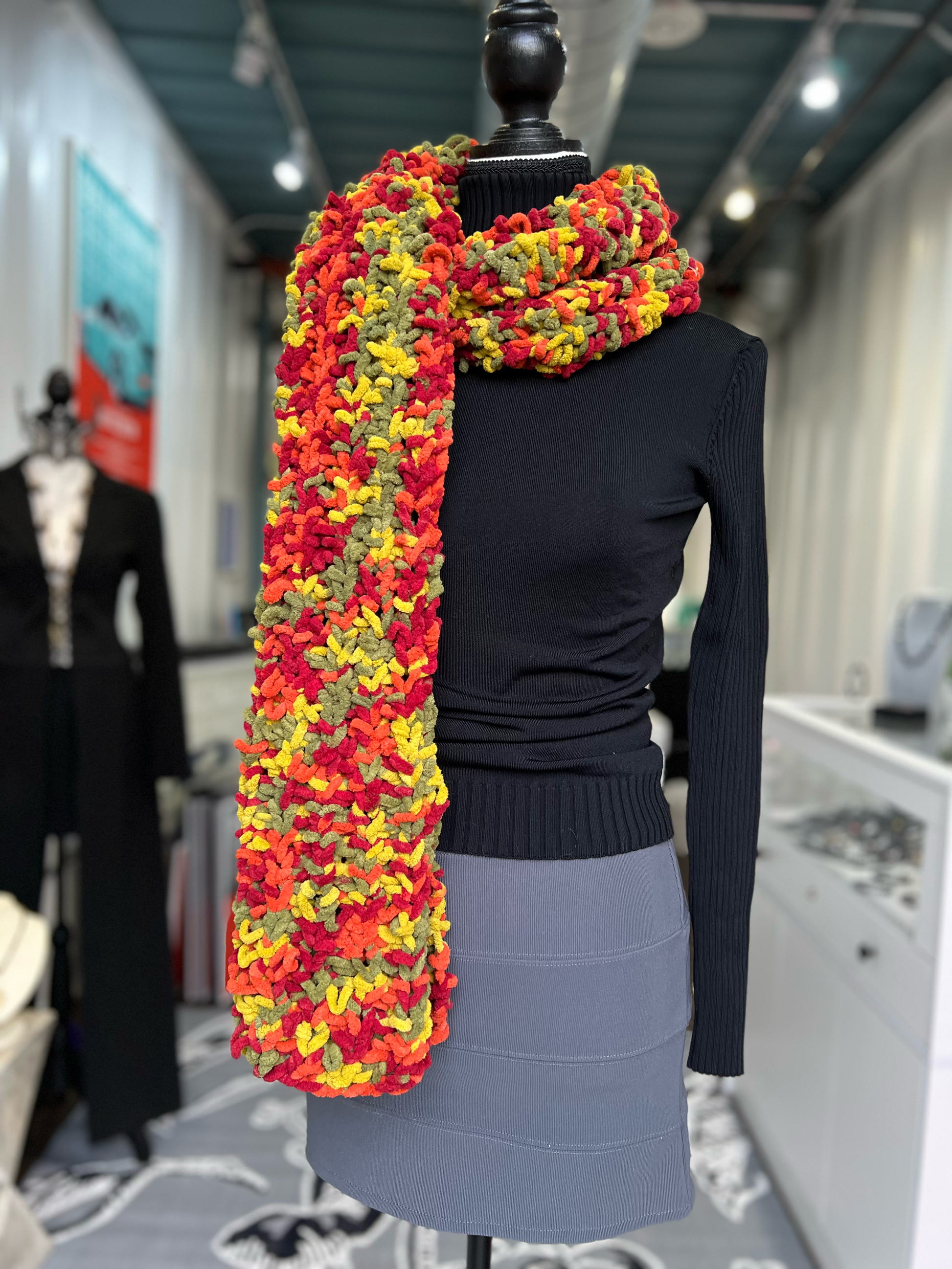 Bold, vibrant, and unapologetically nostalgic — Retro Revival is a tribute to the groovy charm of the 1970s, when color and comfort went hand in hand. Hand-knit with plush blanket yarn, this scarf bursts with personality in rich tones of burgundy, moss green, red, and chartreuse — a palette that could have graced a vintage sofa, now reborn as cozy wearable art.