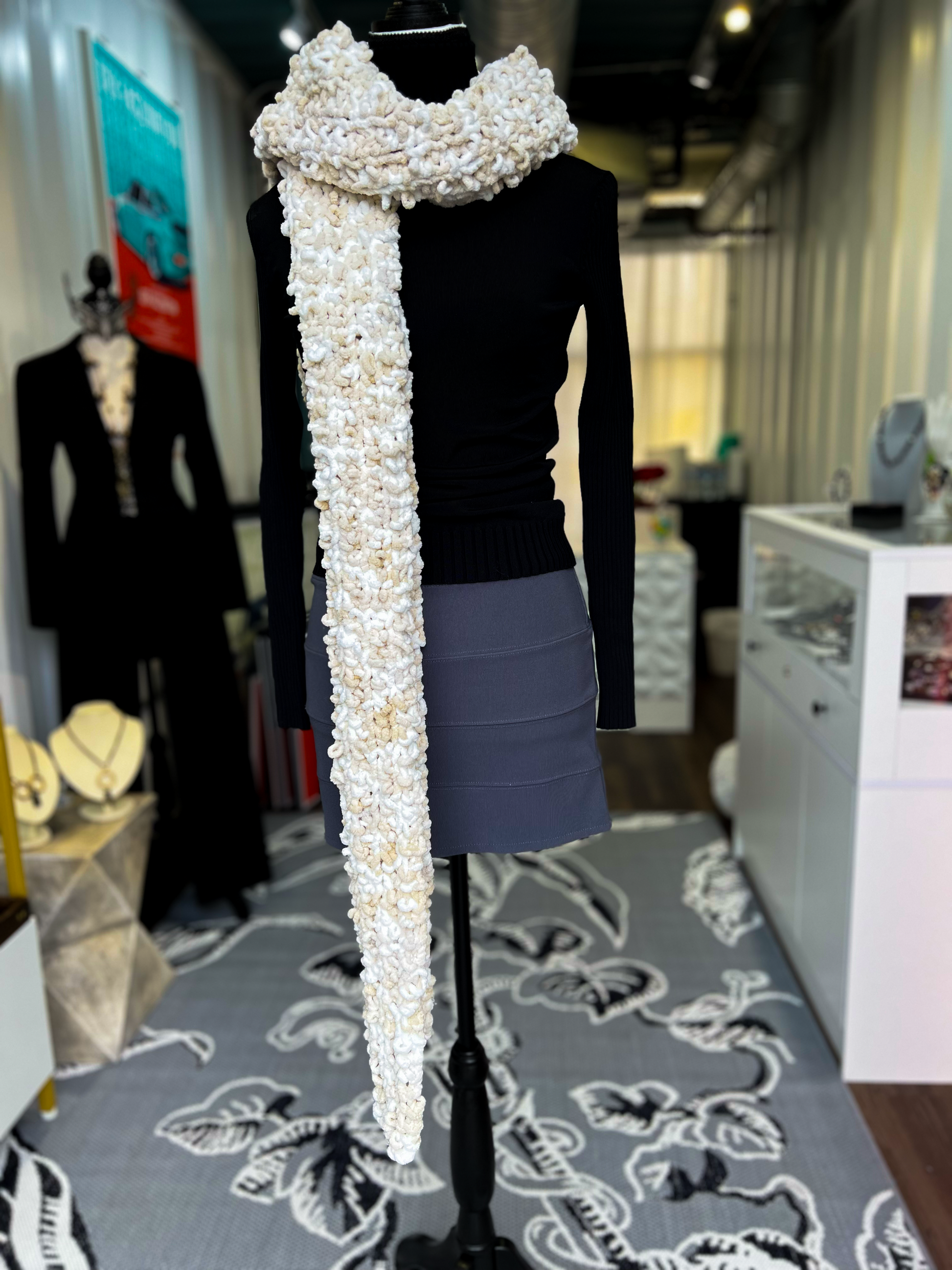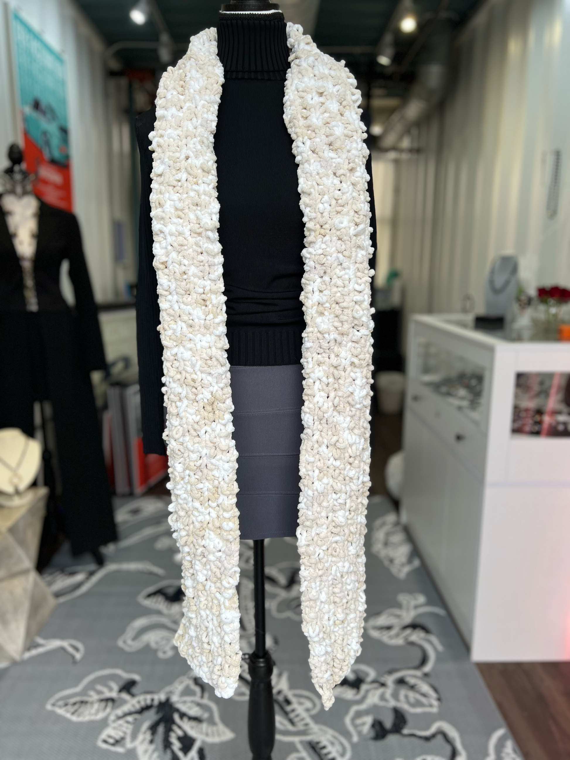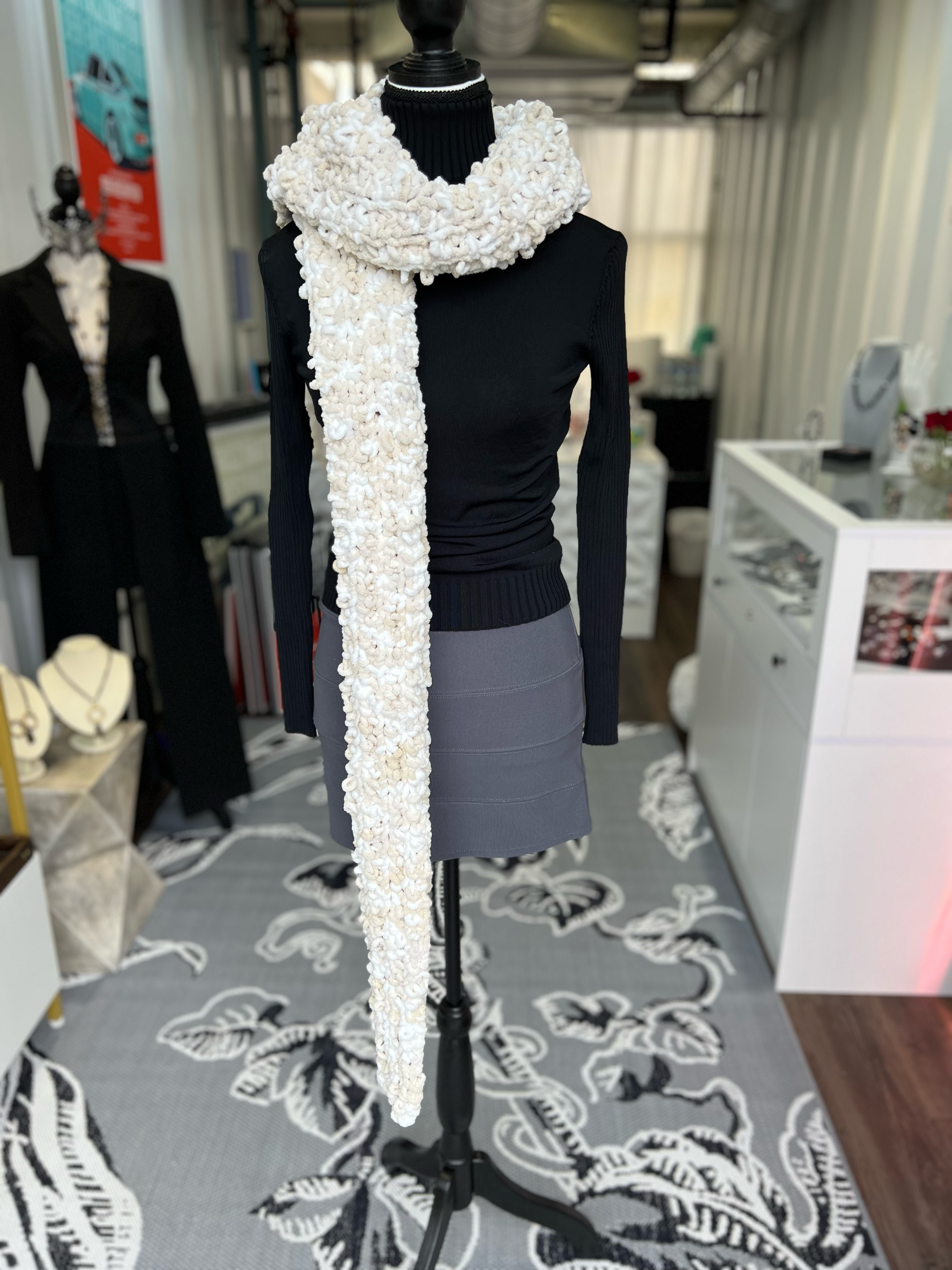 At 7 inches wide and 88 inches long, this scarf drapes gracefully for a refined look or wraps twice for cocooned softness. Its light neutral tones make it endlessly versatile — an effortless complement to any outfit, any day, any season.