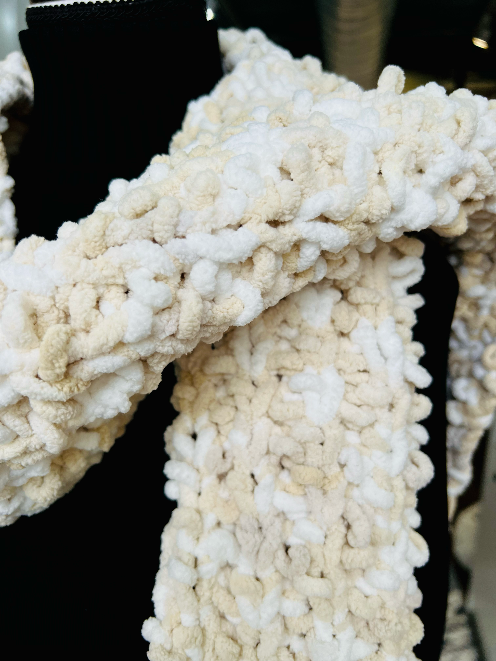 Soft as a sigh and gentle as morning light, Whispered Sand is the quiet soul of the Perfectly Imperfect collection. Hand-knit from plush blanket yarn in soothing shades of beige, white, and creamy ivory, it brings warmth and serenity in every stitch. The subtle shifts in color and texture echo windswept dunes and cozy corners — understated yet deeply comforting.