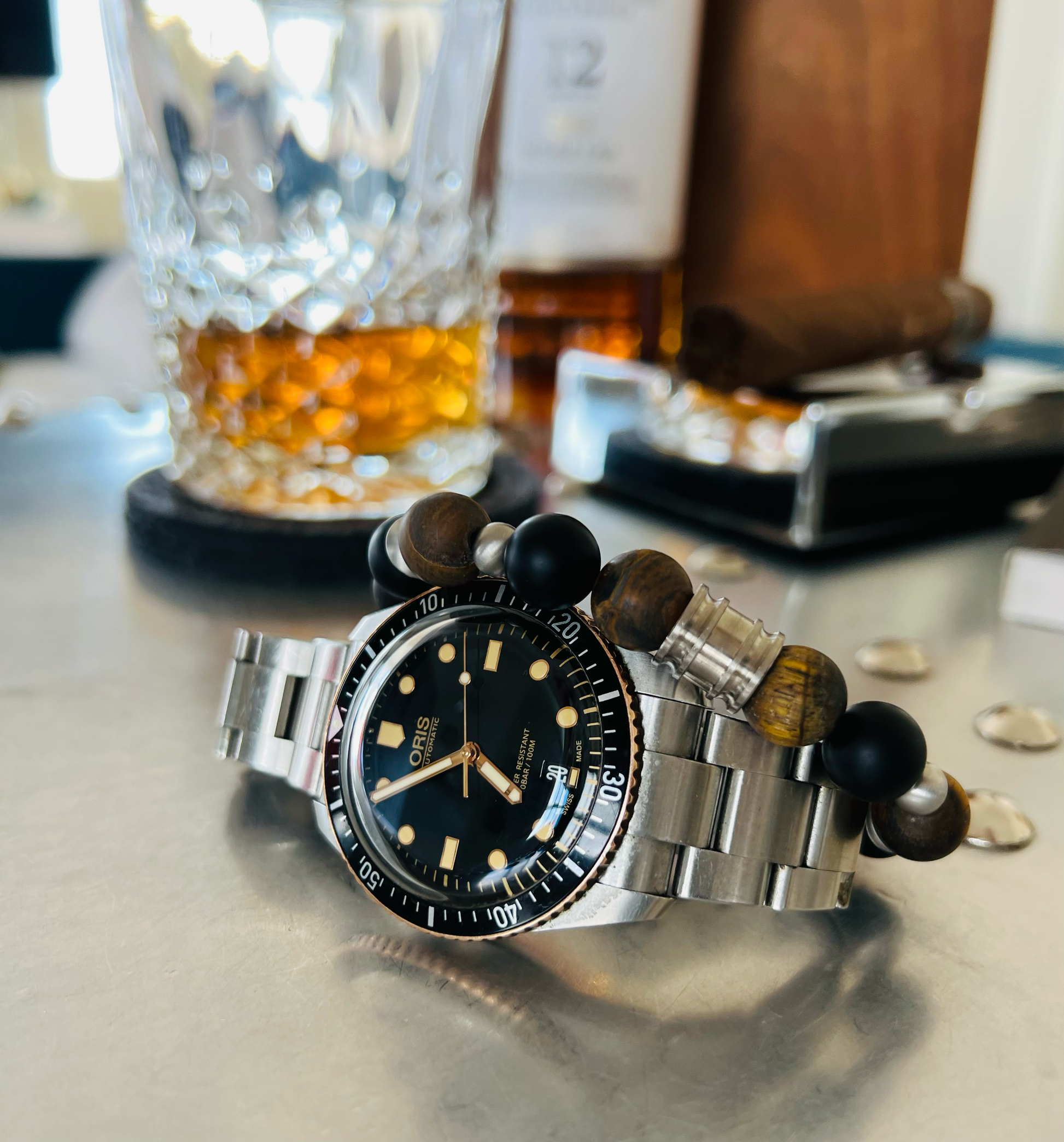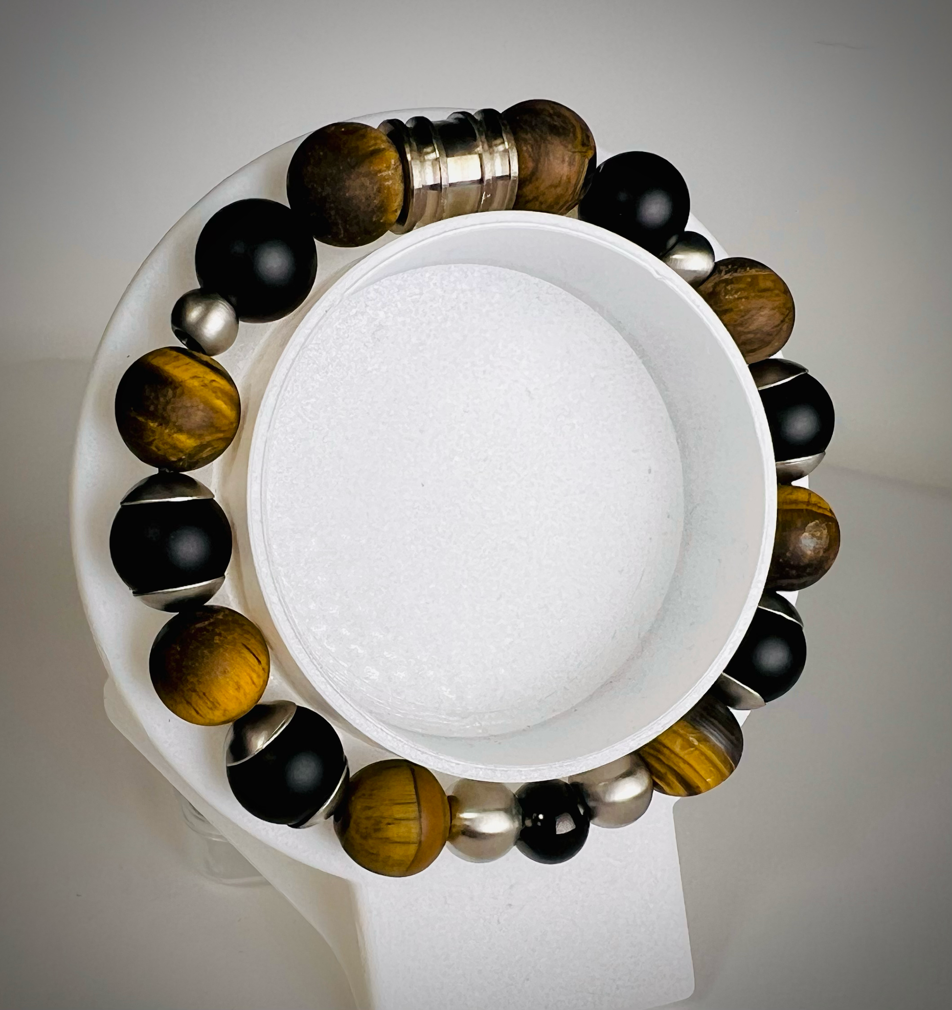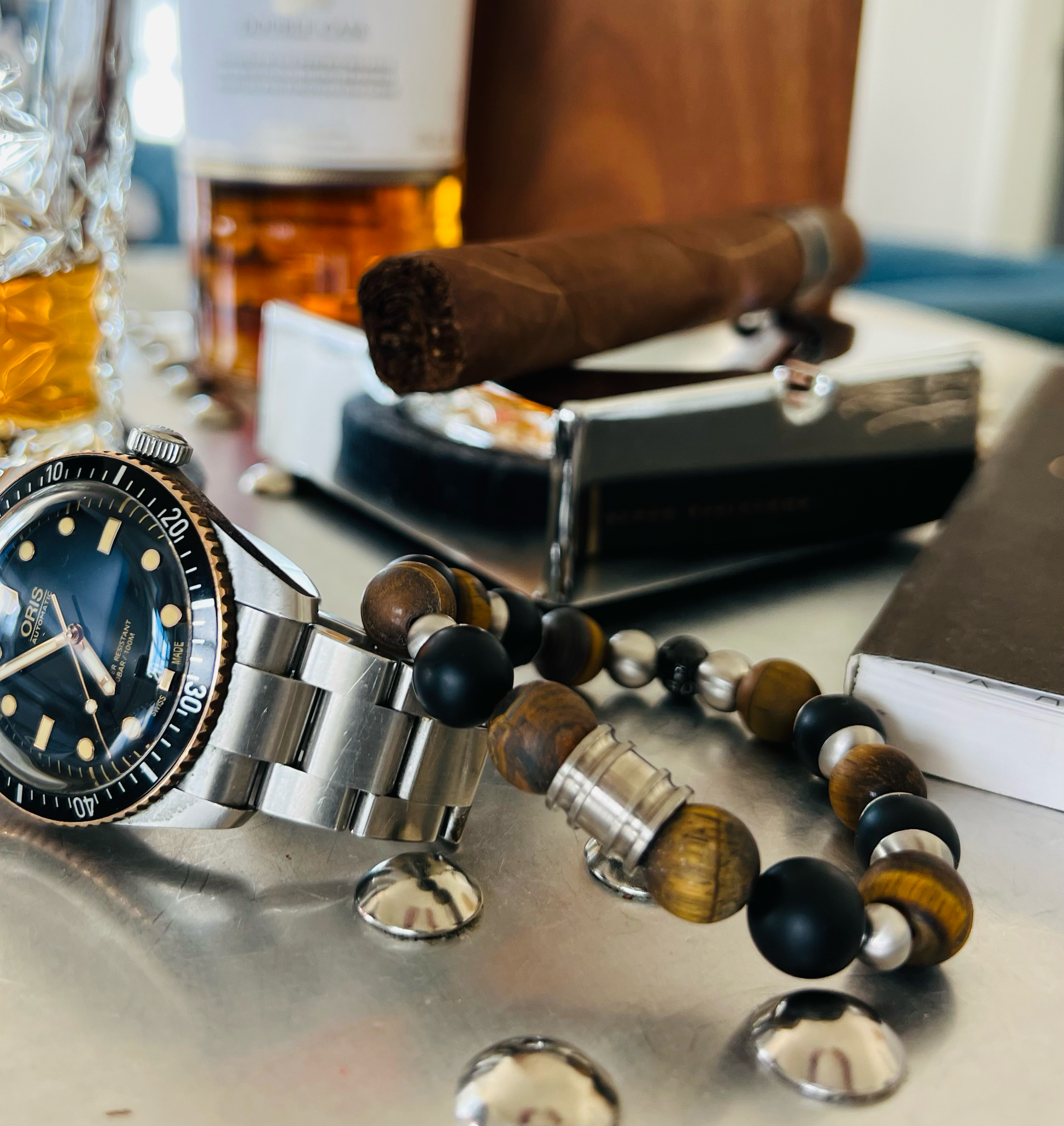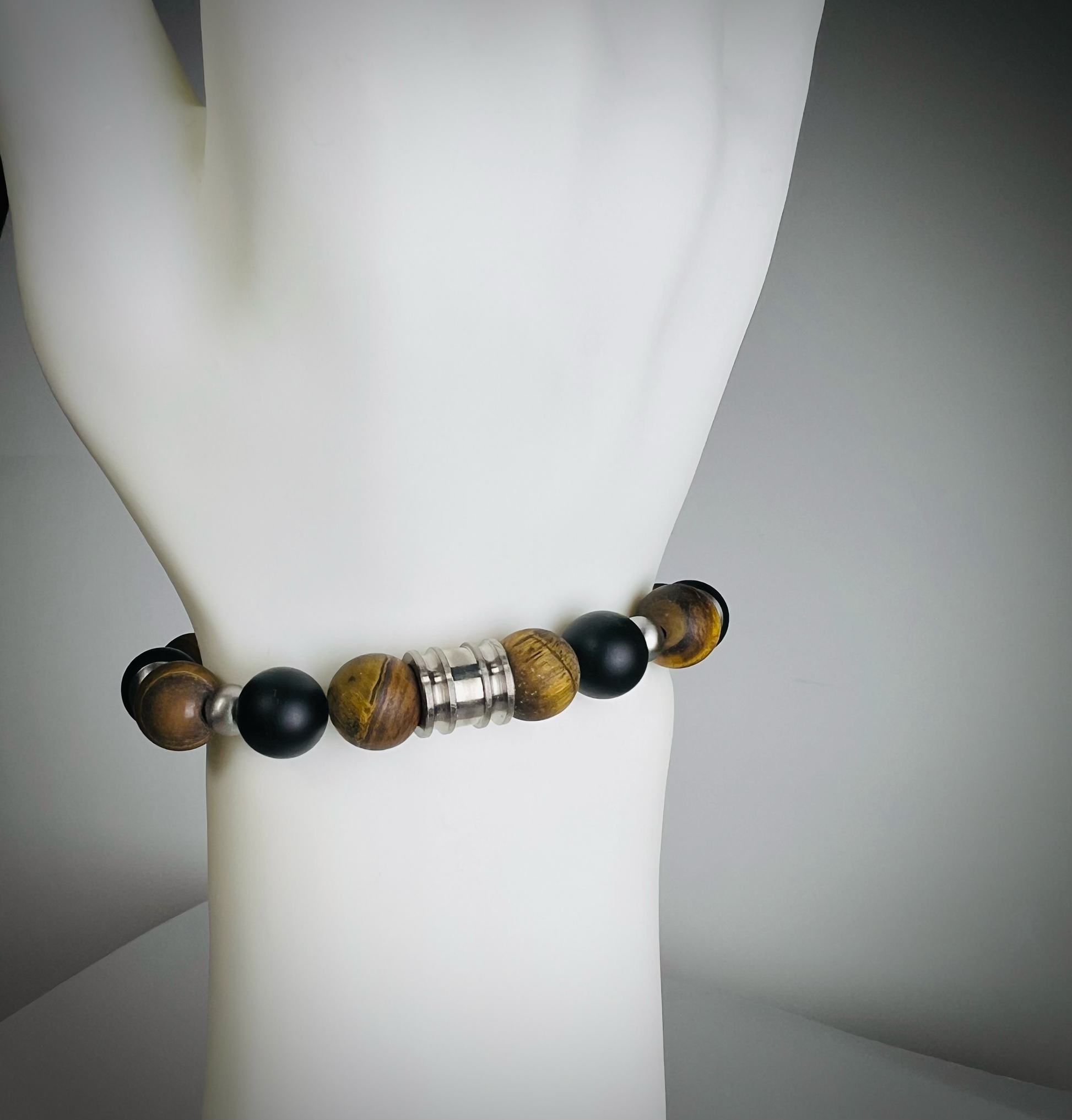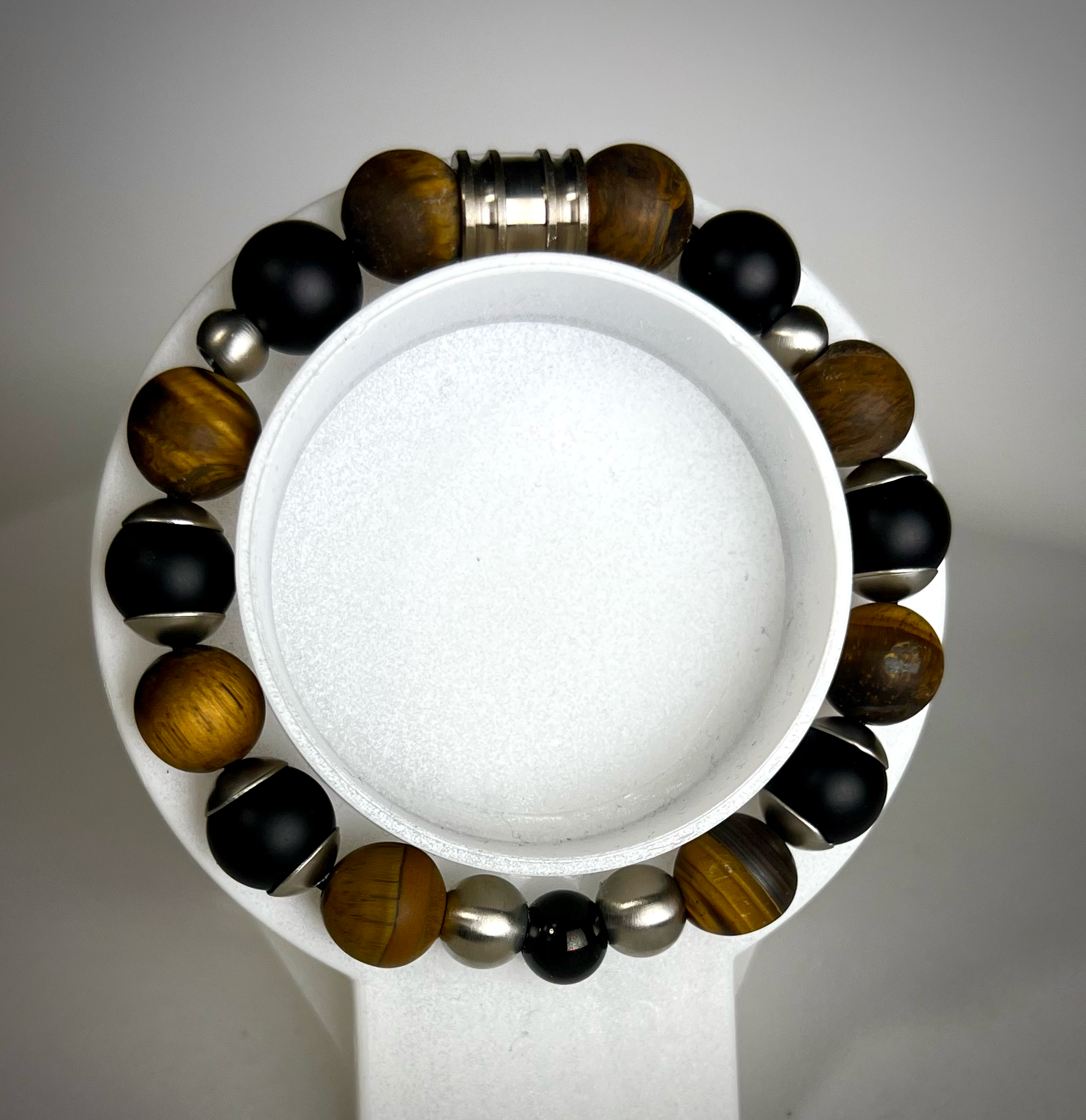 A design forged from steel and tide, Thalassor pairs lathe-cut titanium and hand-brushed stainless steel with the golden shimmer of unpolished yellow tiger eye and the grounded depth of matte black onyx. Built to echo the spirit of deep-sea instruments and time-honored precision, it’s a study in elemental strength — for those who keep time with purpose and poise.
