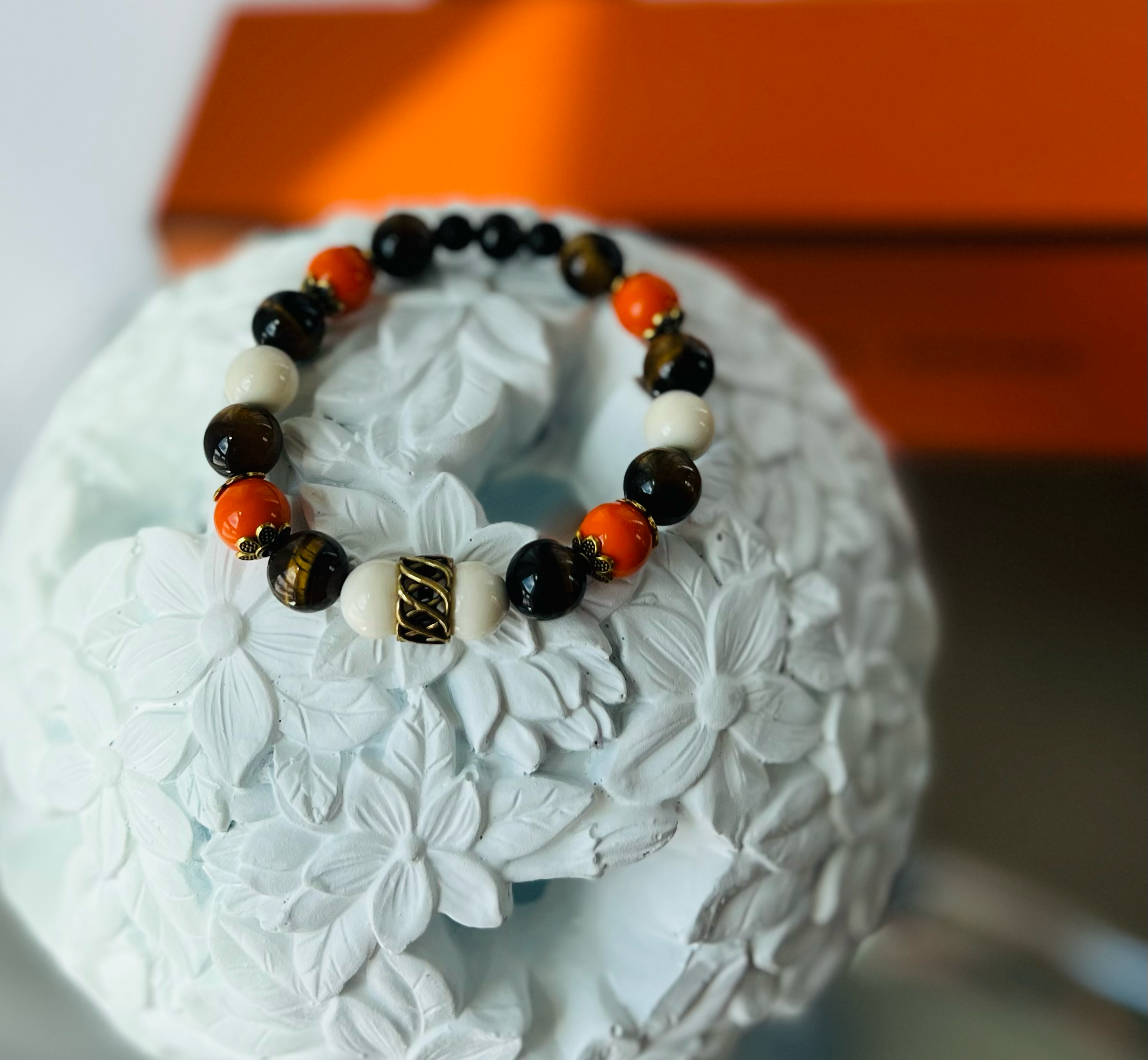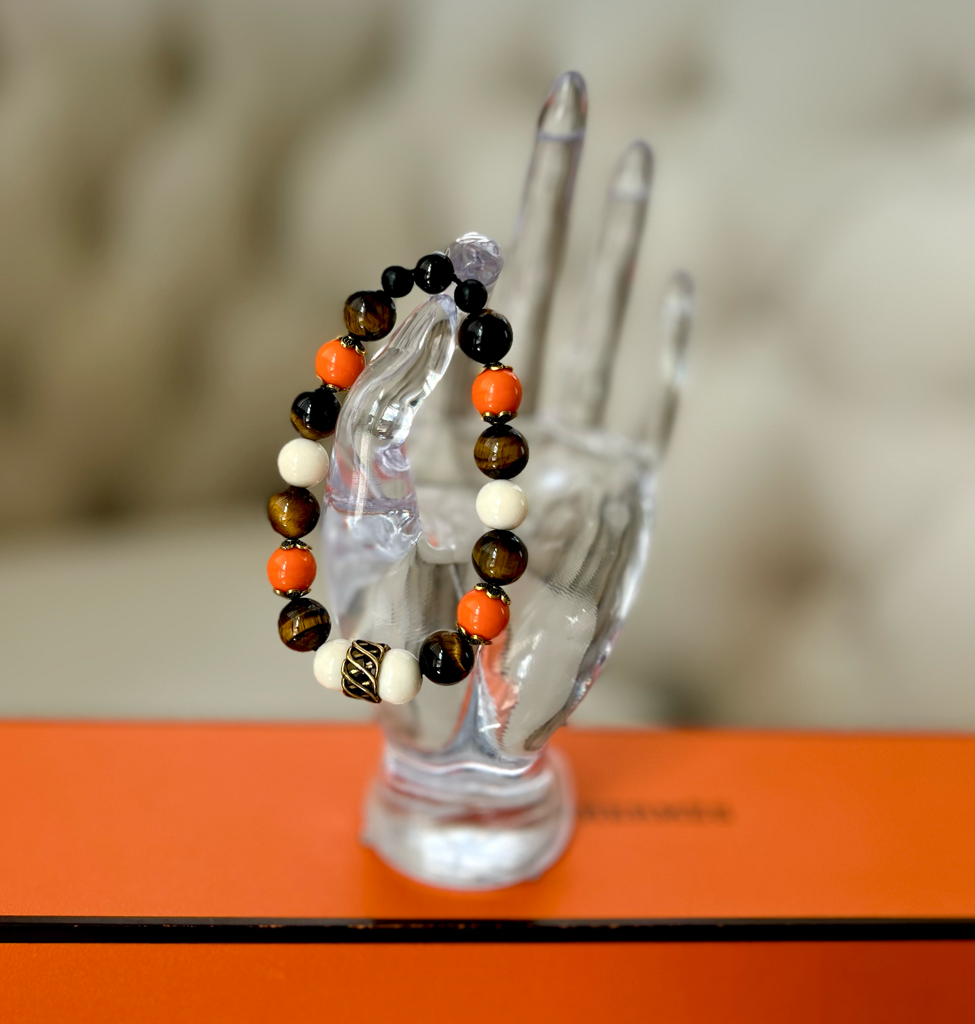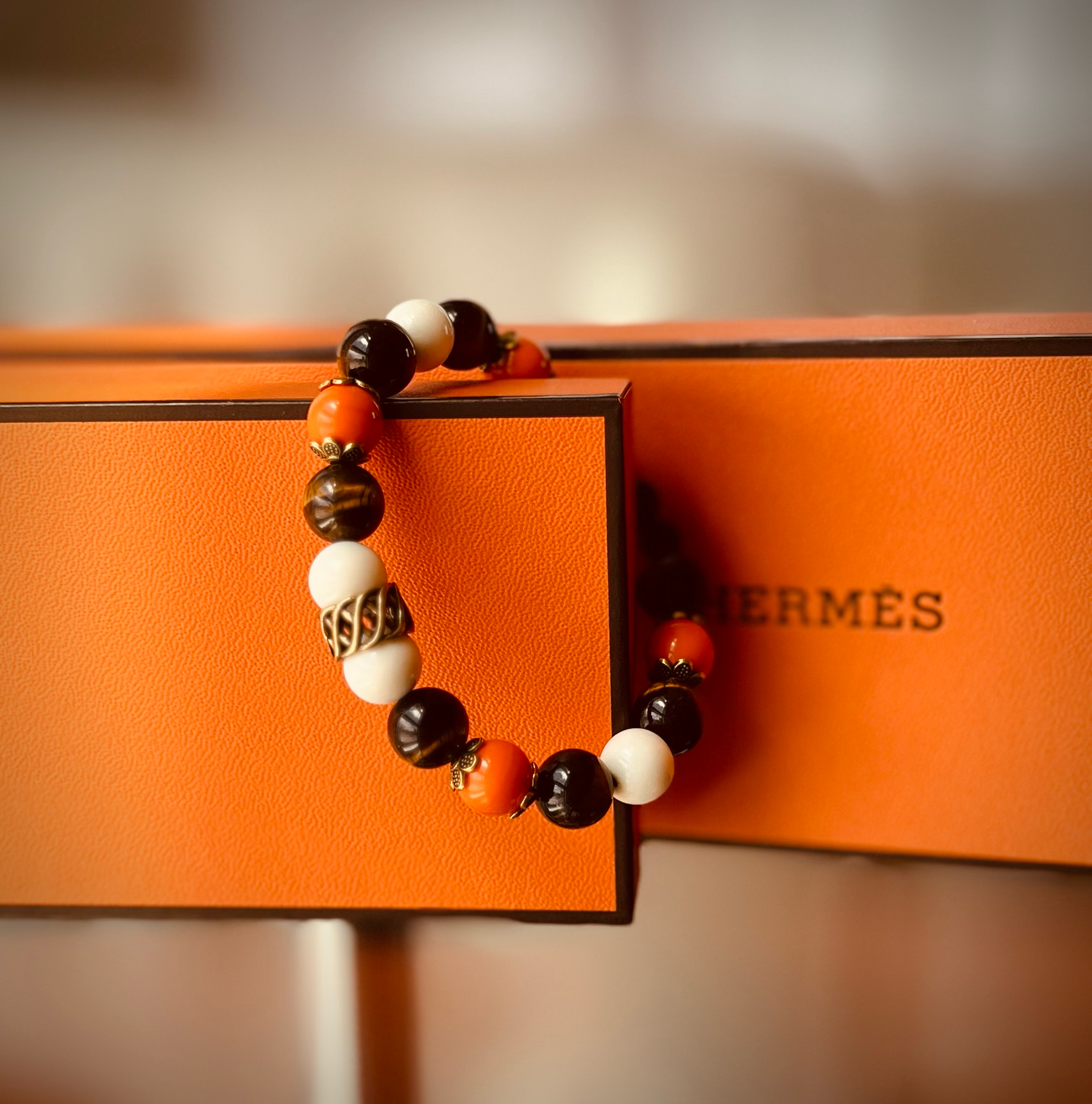 Tressage pays tribute to timeless design with a brass ribbonwork centerpiece — a symbol of crafted elegance. Flanked by polished natural bone, golden tiger eye, matte black onyx, and vivid orange Czech glass in the Hermès signature hue, this bracelet channels equestrian heritage, haute couture, and worldly refinement in every thread of its design.