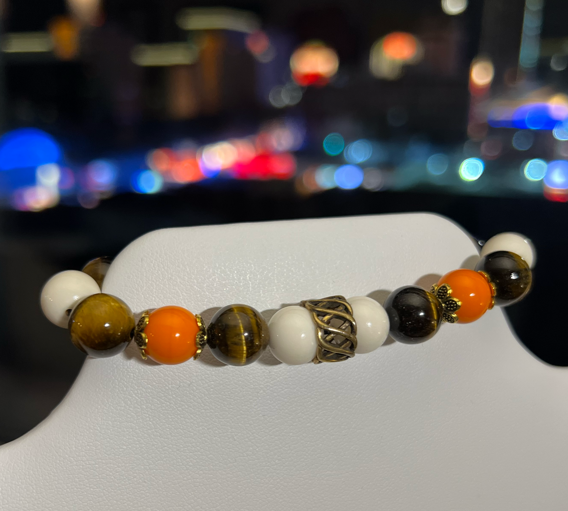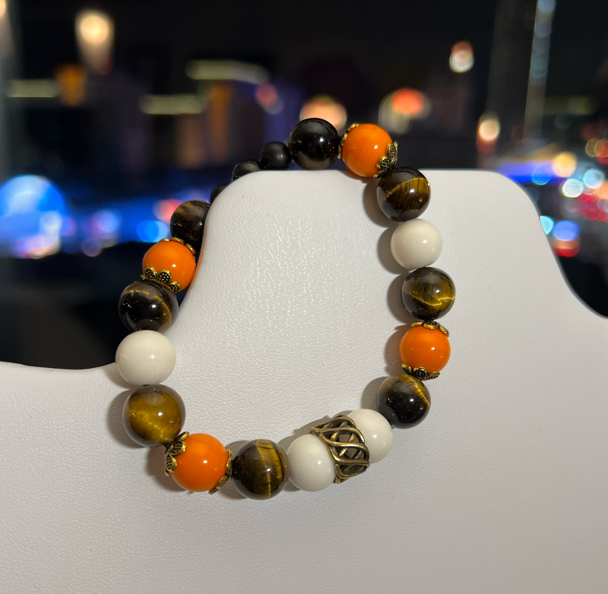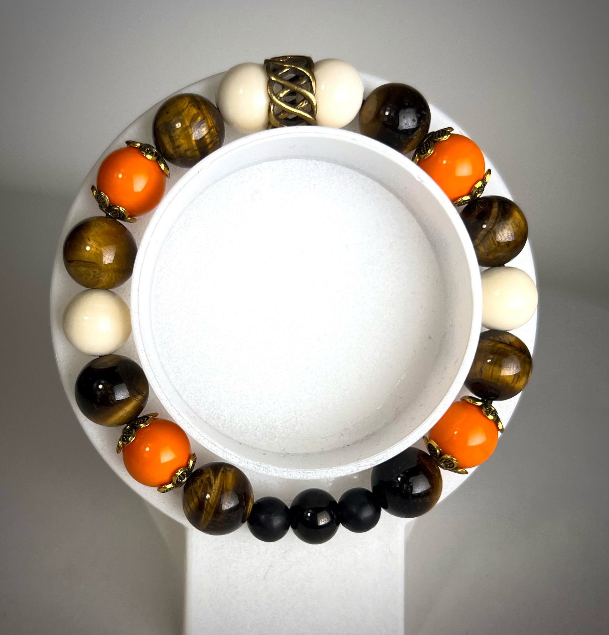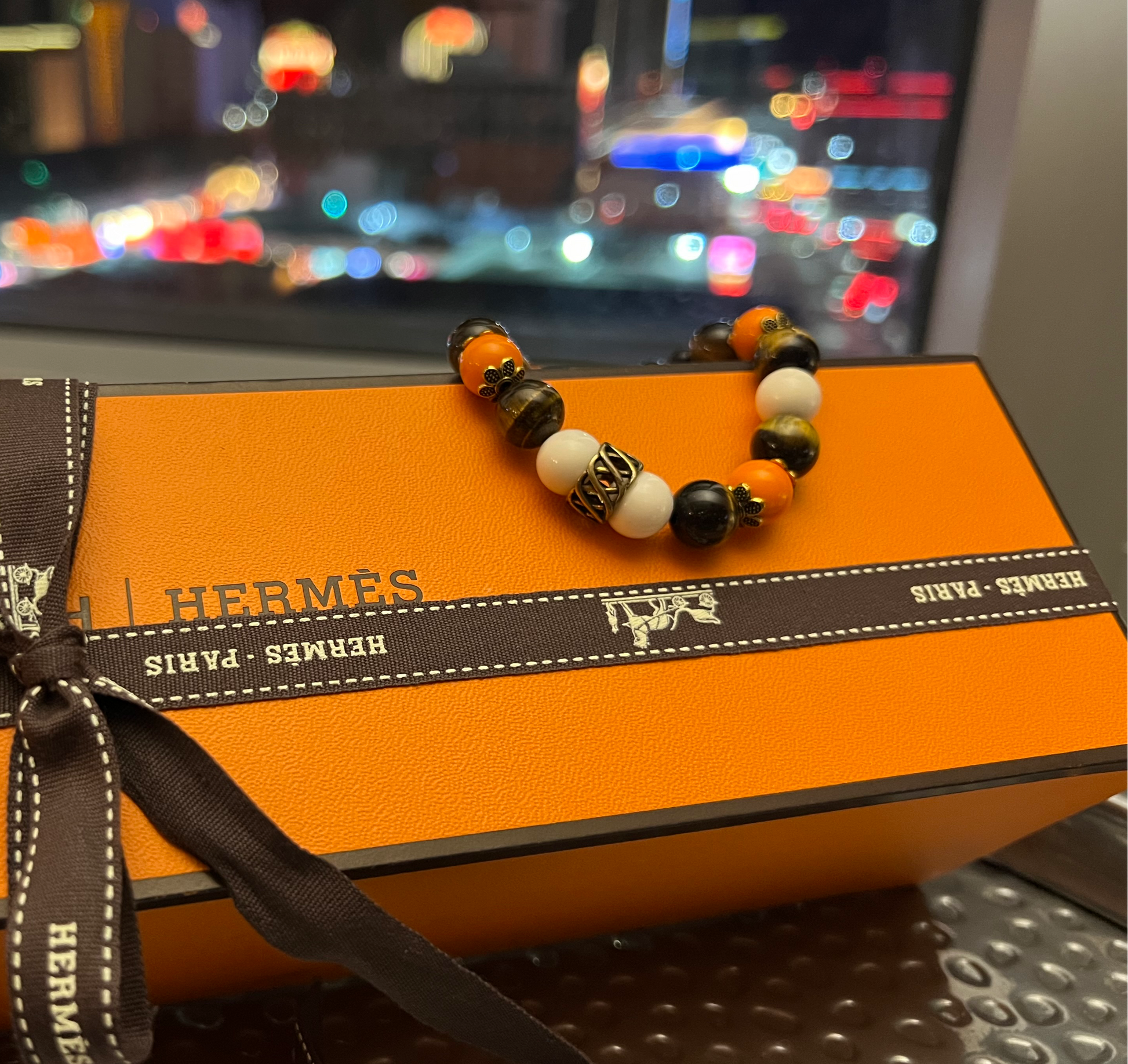 Tressage pays tribute to timeless design with a brass ribbonwork centerpiece — a symbol of crafted elegance. Flanked by polished natural bone, golden tiger eye, matte black onyx, and vivid orange Czech glass in the Hermès signature hue, this bracelet channels equestrian heritage, haute couture, and worldly refinement in every thread of its design.