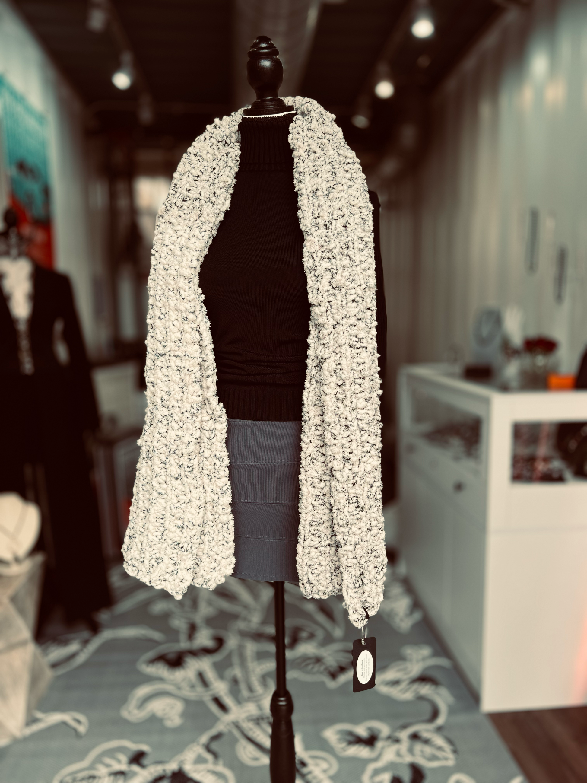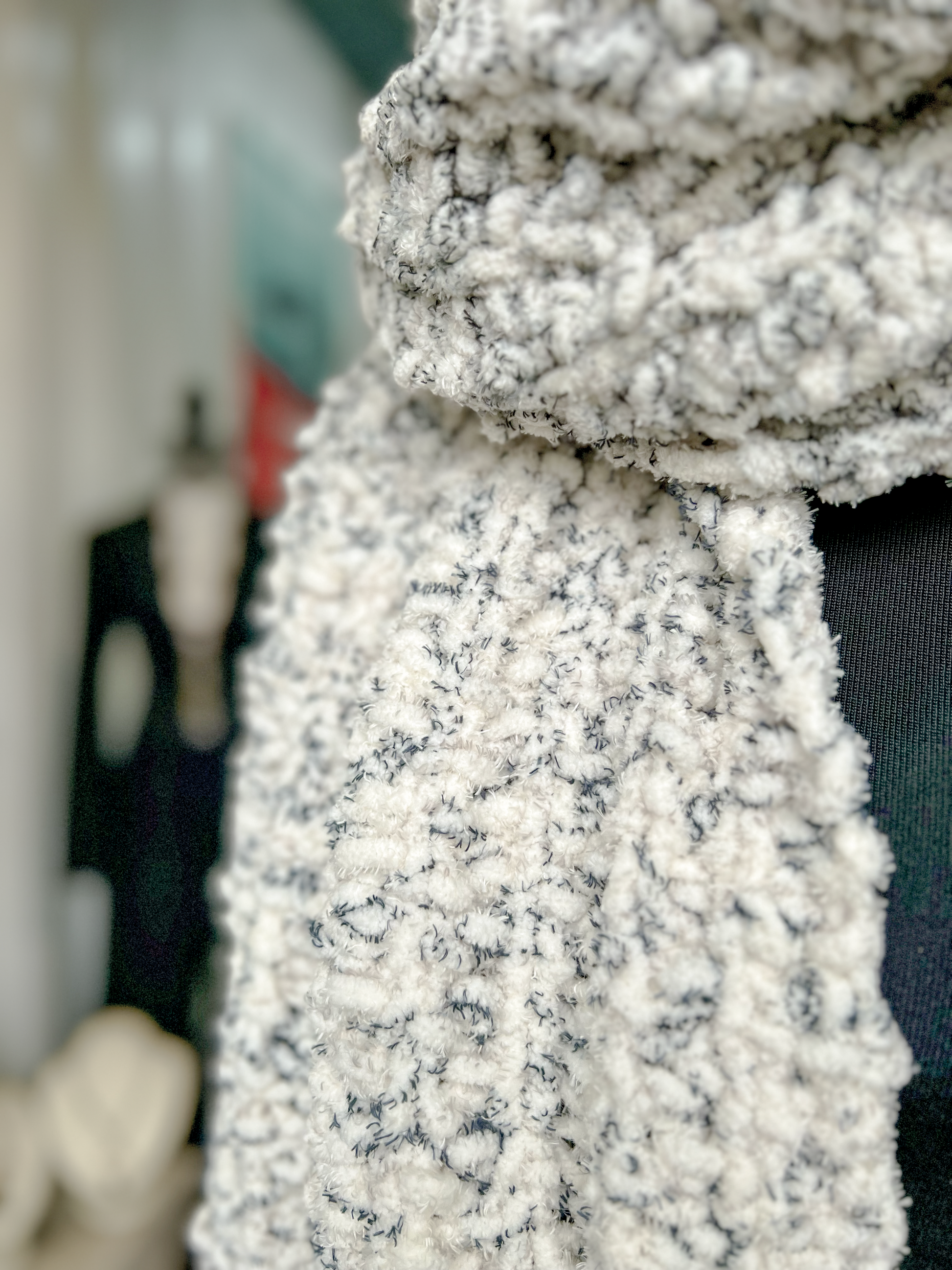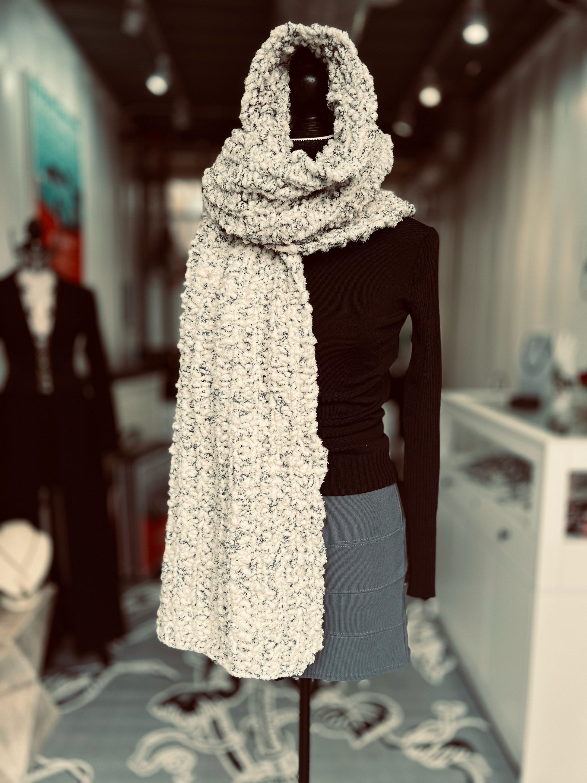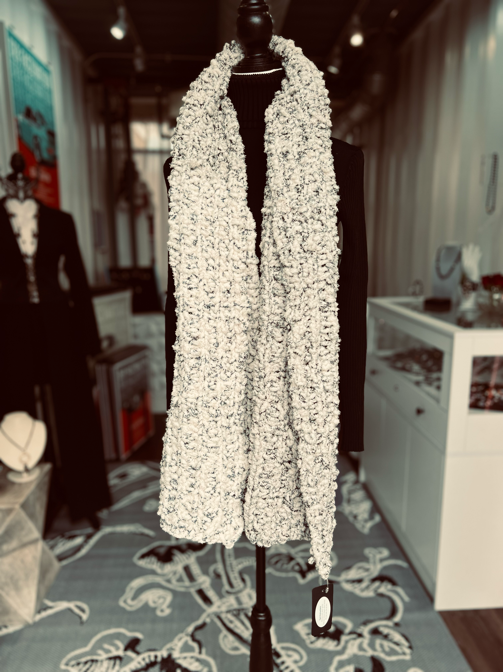 Soft as freshly fallen snow and sprinkled with subtle black speckles, Winter Whispers is a chunky-knit scarf that feels like a gentle hush on a cold morning. Handcrafted from ultra-soft blanket yarn, it measures 16 inches wide by 73 inches long — the perfect size to wear however comfort calls: draped loosely over the head and wrapped around the neck, or spread across the shoulders like a cozy shawl.